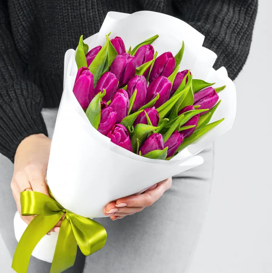 У нас можно заказать 17 Сиреневых тюльпанов в белой упаковке за 4570 руб.
