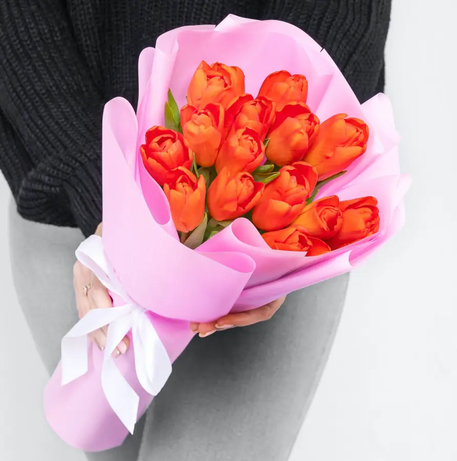 На фото - Букет 15 рыжих тюльпанов. В составе данной композиции: Тюльпан рыжий - 15 шт,