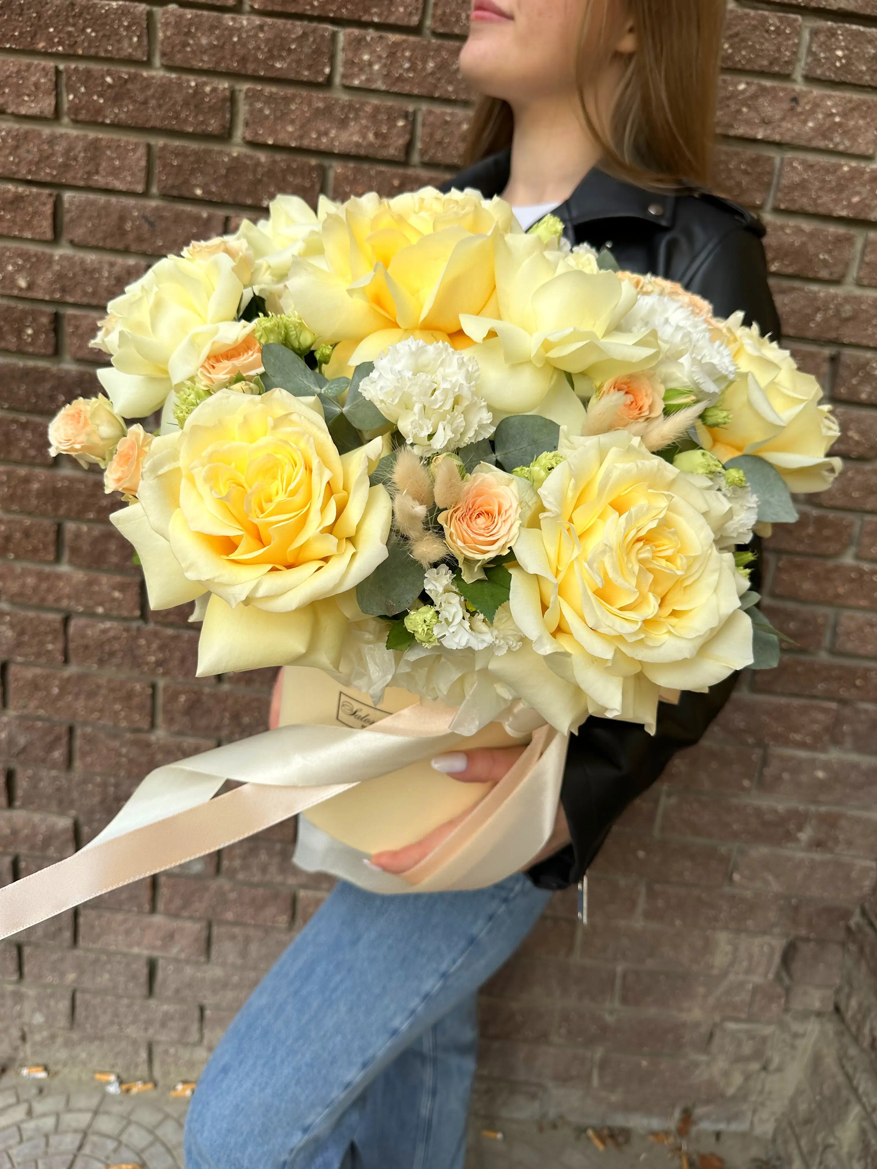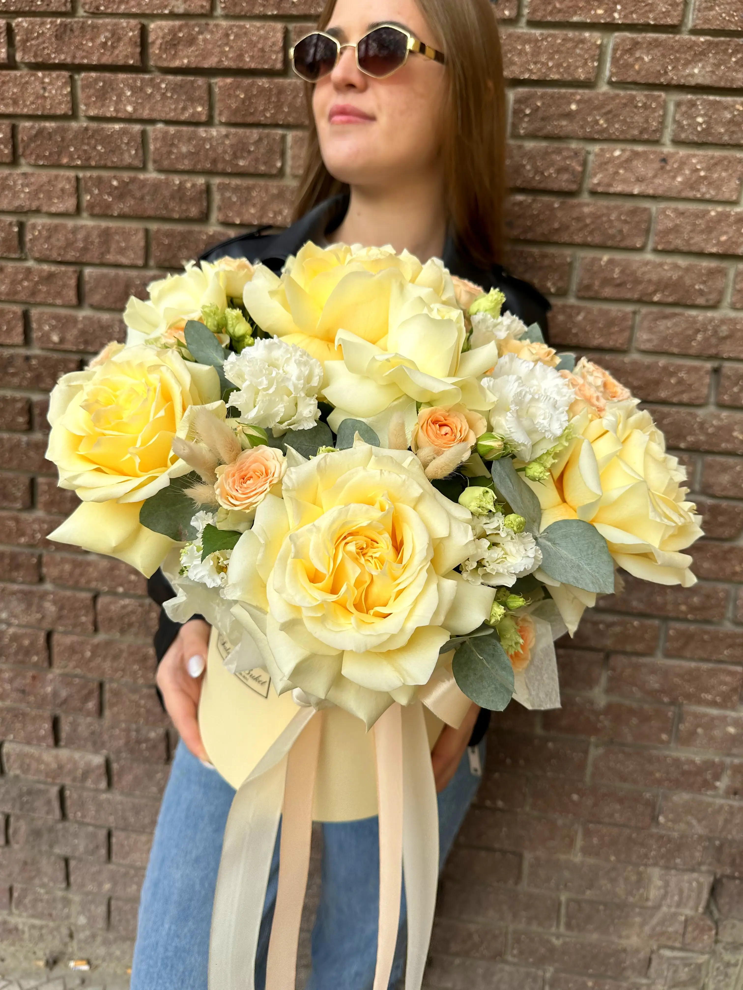 На фото - Композиция с эустомой и розами . В составе данной композиции: Роза Пионовидная - 5 шт,
