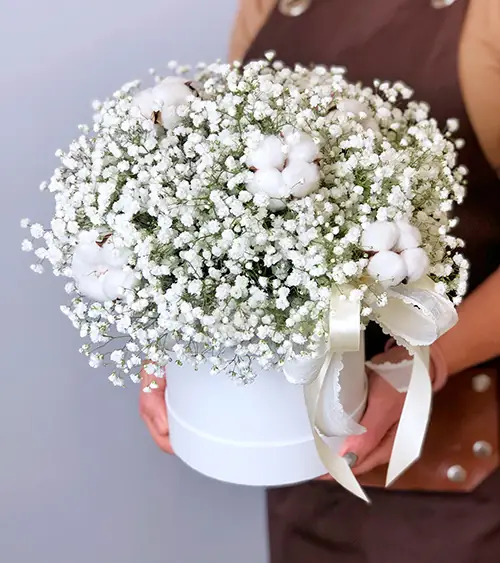 Пушистое облачко белой гипсофилы с хлопком в шляпной коробке.