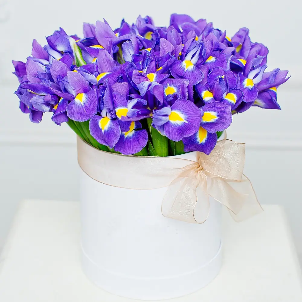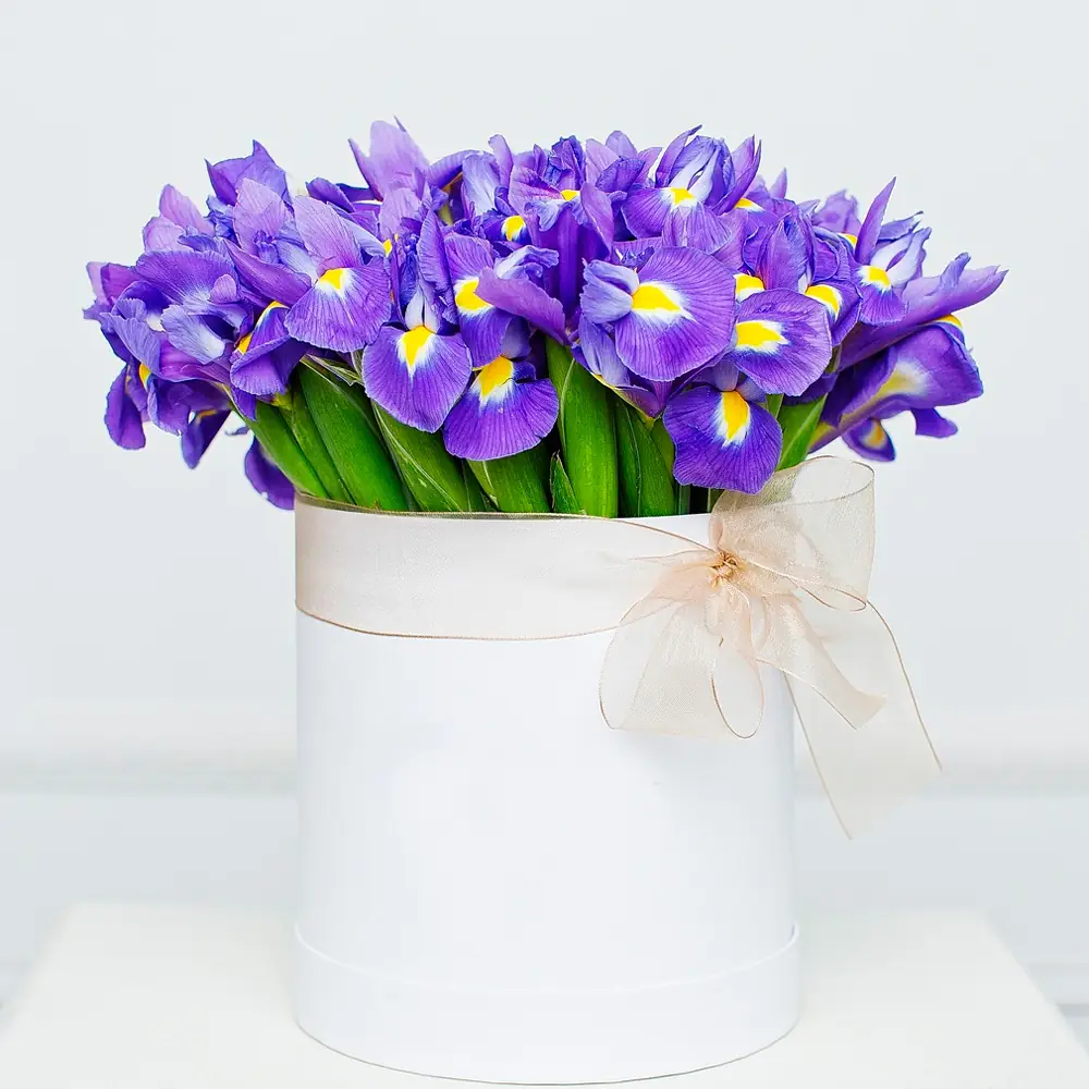 Ярко-фиолетовые ирисы в белоснежной шляпной коробке.