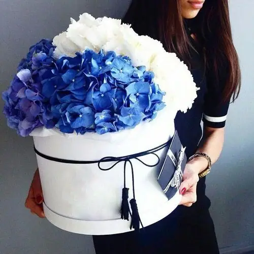 На фото - Шляпная коробка "7 Гортензий" . В составе данной композиции: Гортензия синяя - 4 шт.,