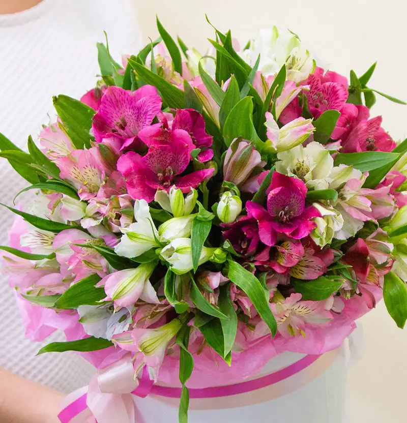На фото - Шляпная коробка "Нежные чувства" . В составе данной композиции: Альстромерия - 13 шт.,