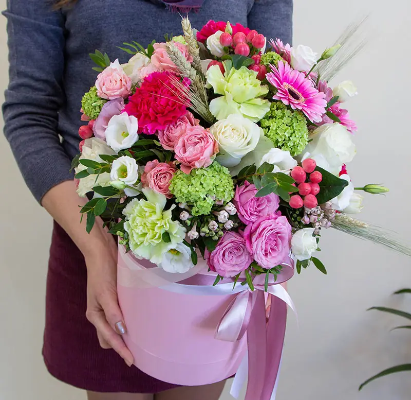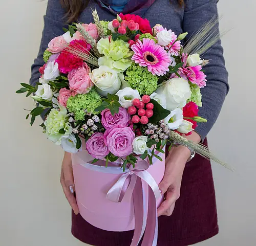 Шикарная и очень объемная шляпная коробка с цветами для великолепной женщины.