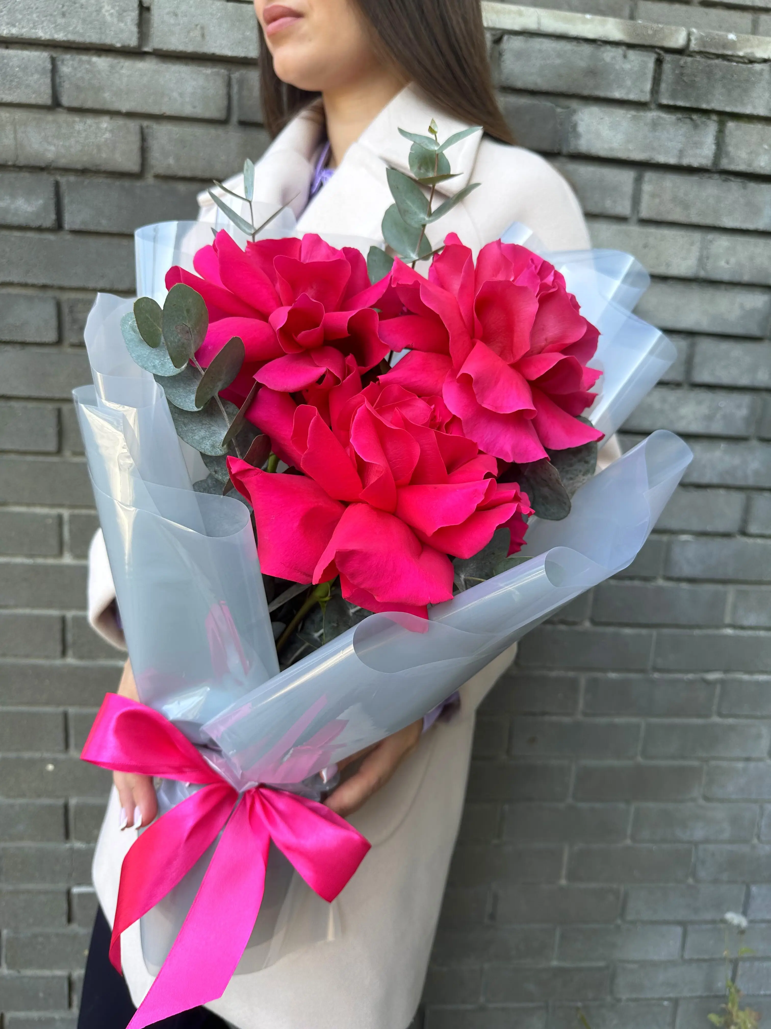 Розы в букете имеют насыщенный розовый цвет, который символизирует любовь, страсть и нежность. Эвкалипт добавляет композиции свежести и легкости, делая ее еще более привлекательной.