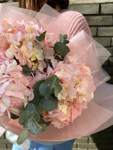 Гортензии - символ любви и нежности, а их розовый цвет добавит в подарок романтический оттенок. Эвкалипт, в свою очередь, обладает свежим и приятным ароматом, который будет радовать получателя на протяжении всего времени, пока букет будет стоять в вазе.