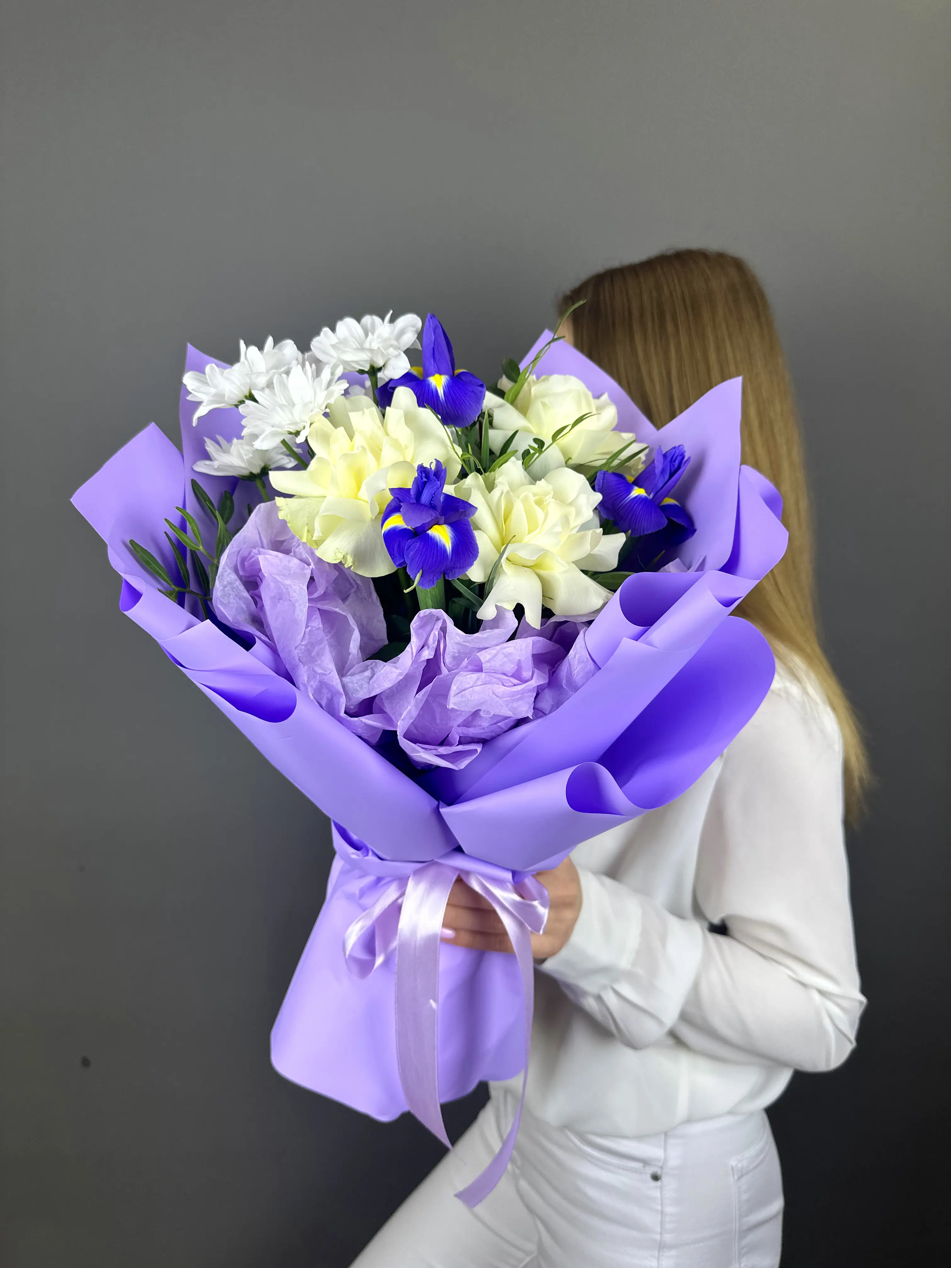Розы и ирисы - это символ любви и страсти, которые гармонично сочетаются в этом букете.