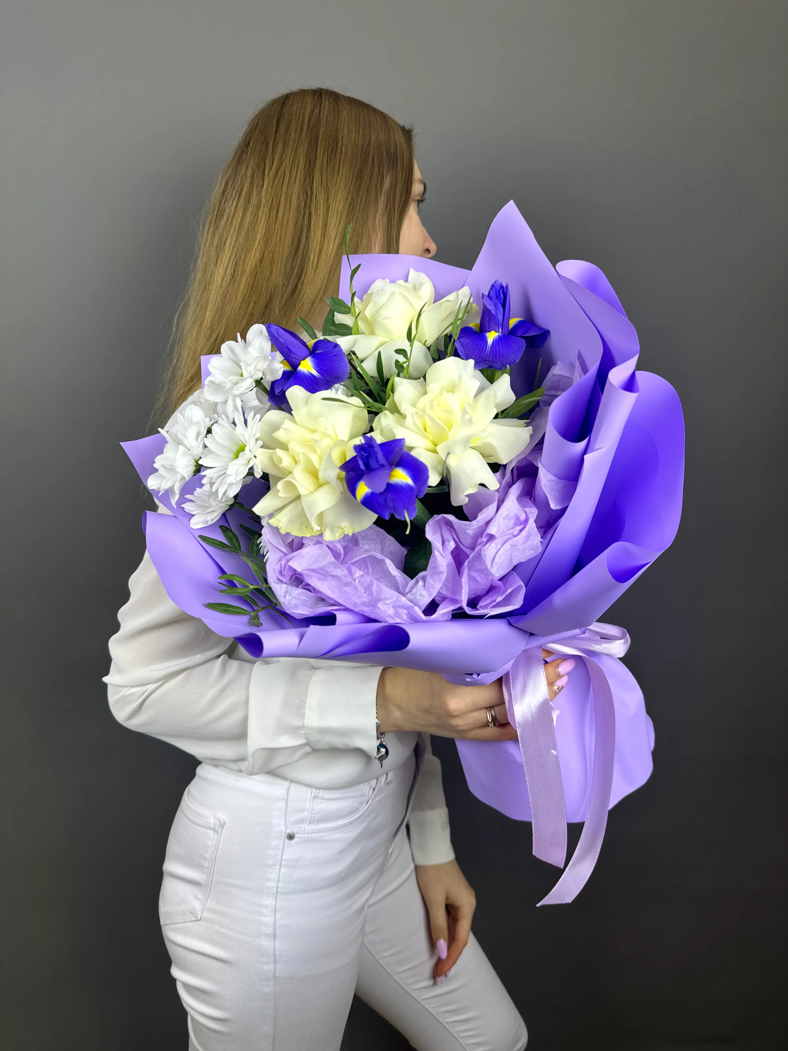 Букет с розами и ирисами - это сочетание красоты и изящества, которое станет прекрасным подарком для любого случая.