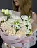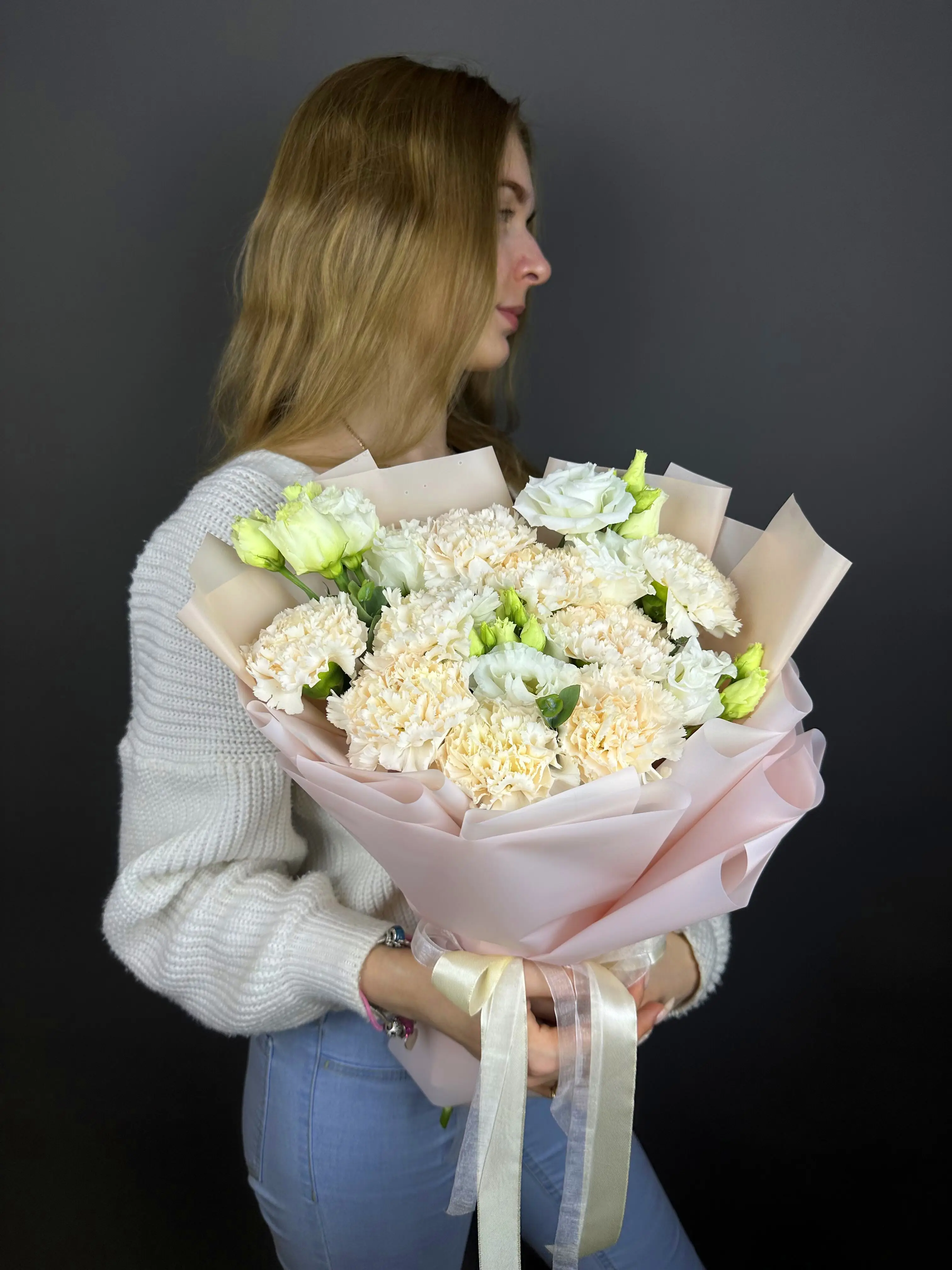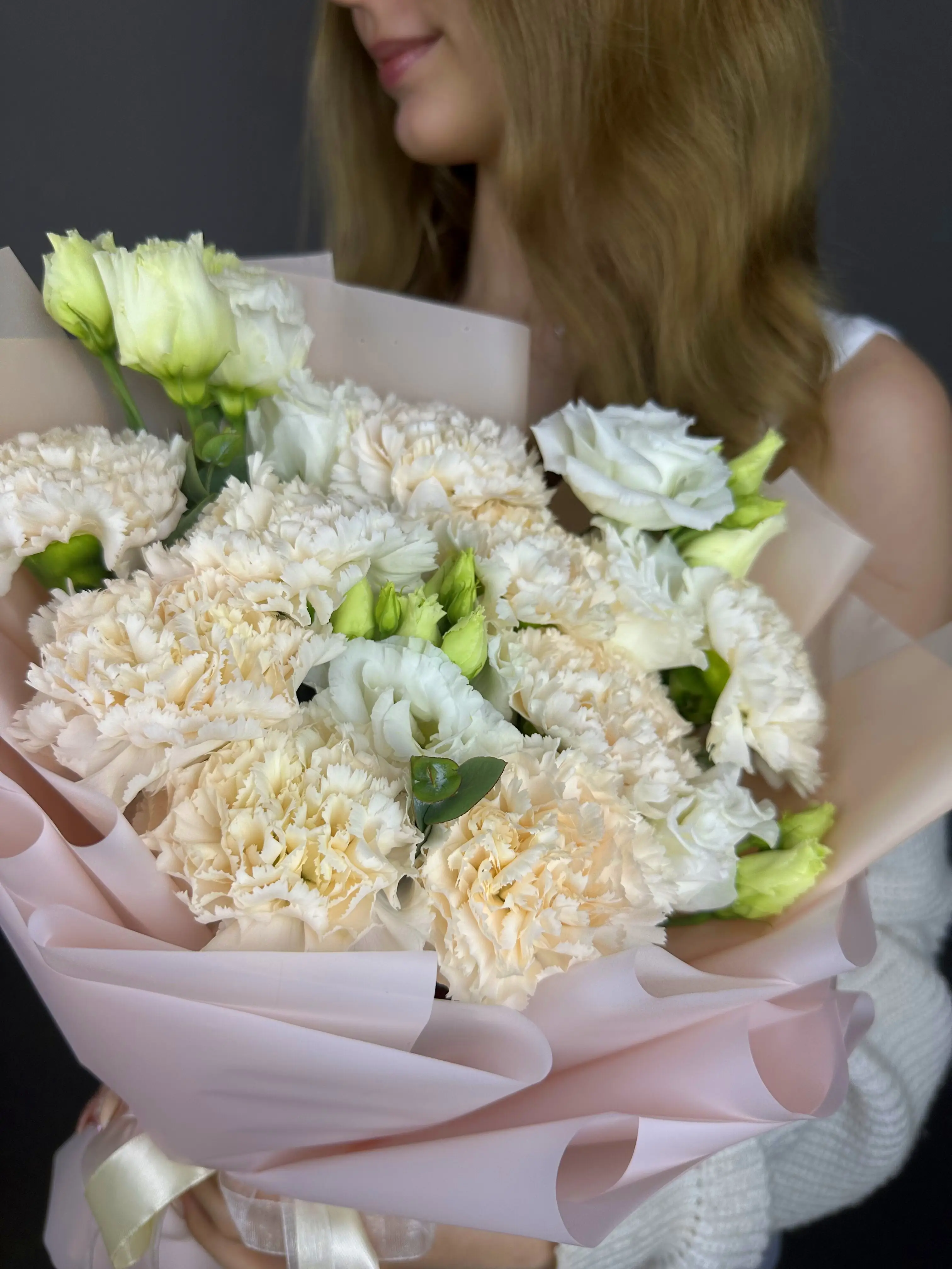Букет состоит из 12 цветов, включая 9 штук диантуса и 3 штуки эустомы. Эти цветы имеют приятный белый и бежевый оттенок, который будет гармонично смотреться в любом интерьере.
