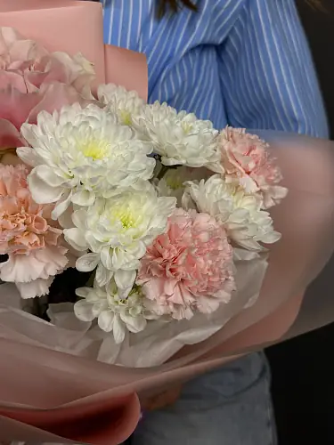 Нежный букет живых цветов с диантусами и хризантемой в дизайнерской упаковке - это изысканный подарок, который станет прекрасным дополнением к любому торжеству или событию.