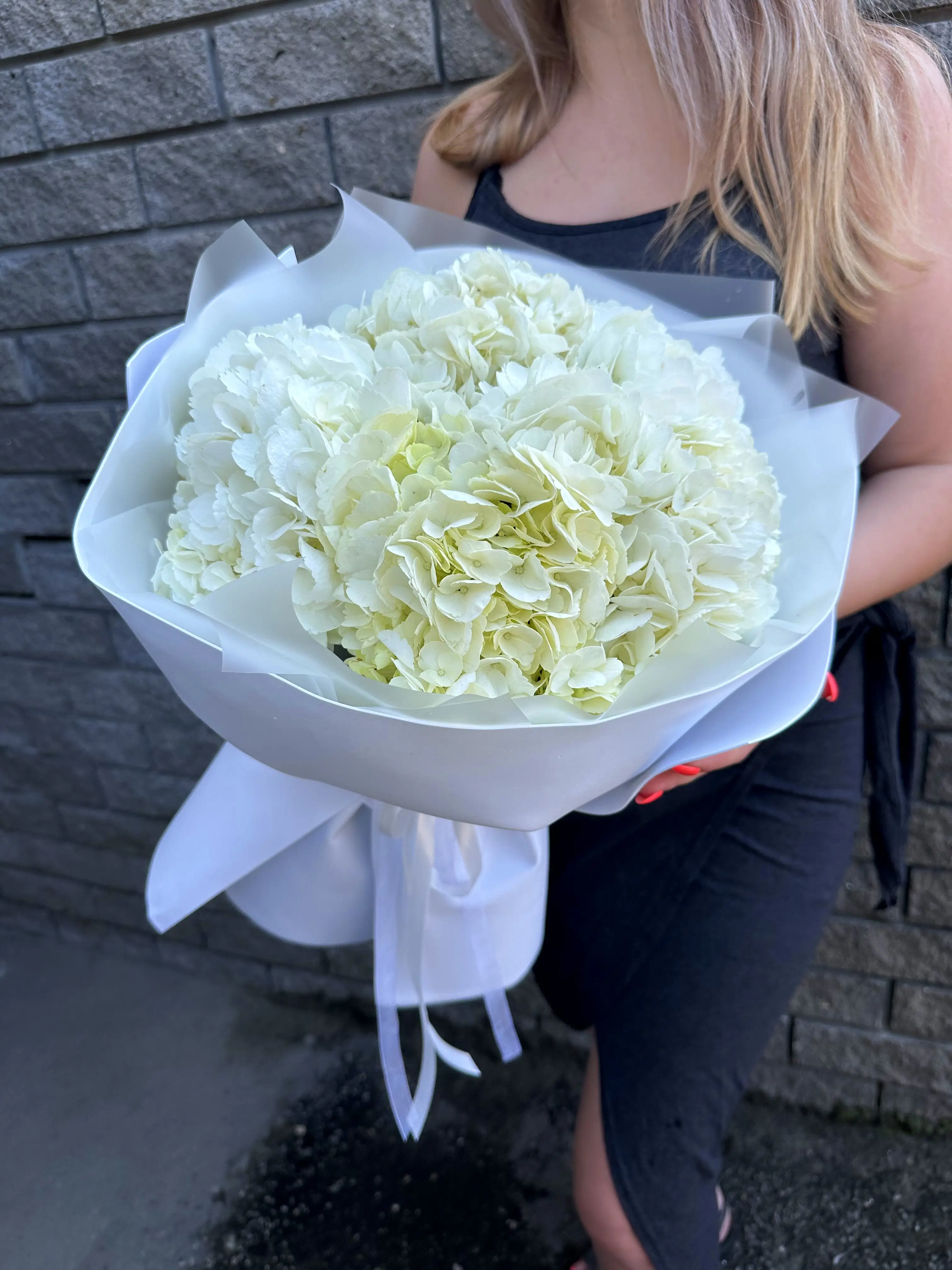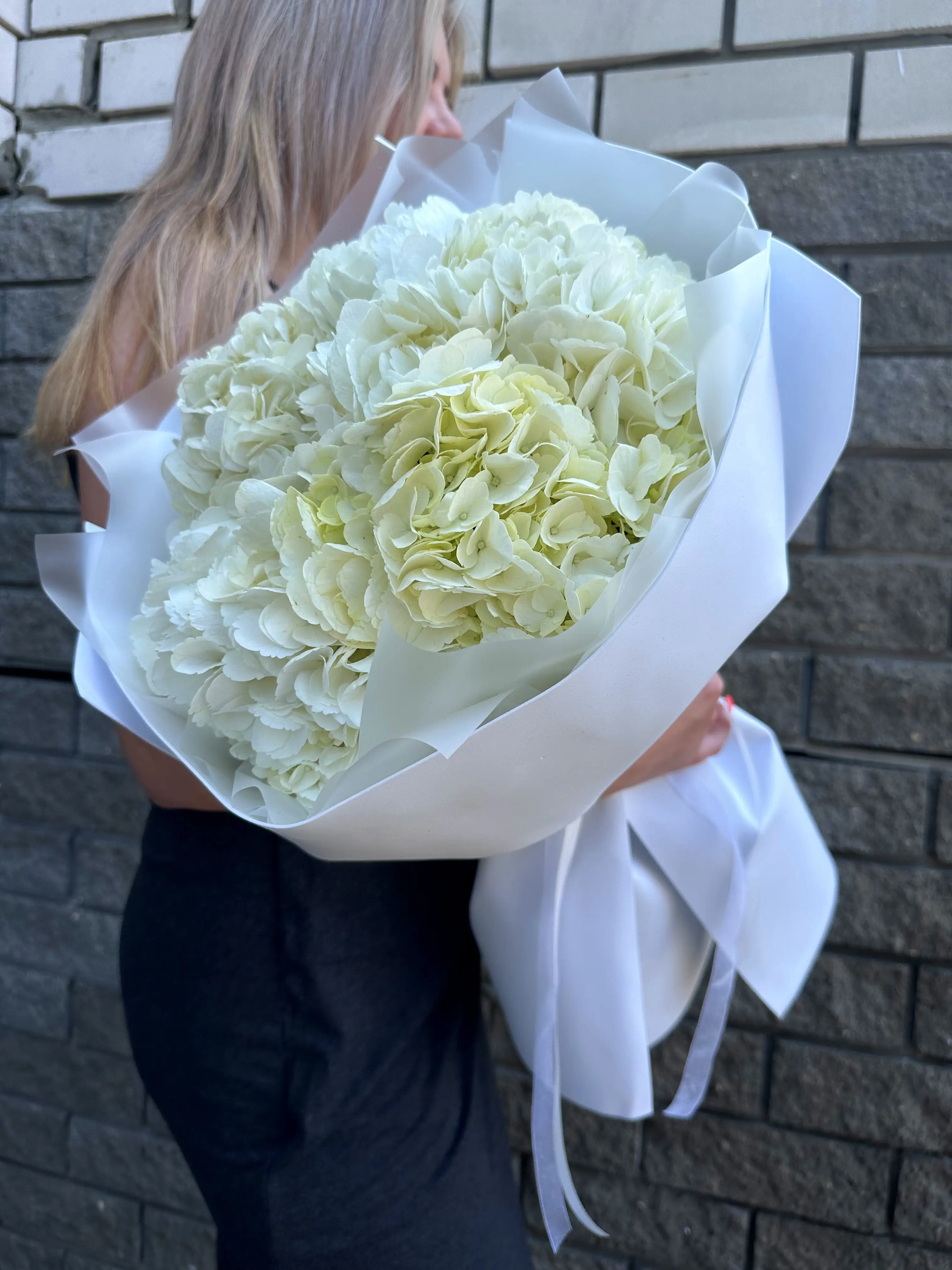 Букет живых цветов из 5 белых гортензий, оформленный в дизайнерскую упаковку, станет прекрасным подарком для любого случая.