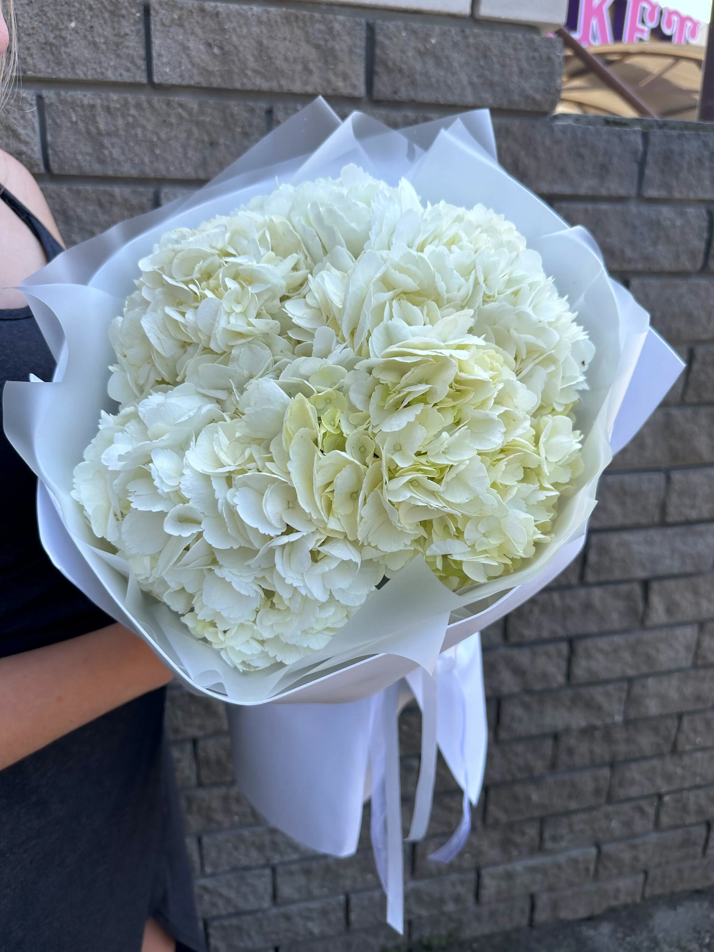 Букет живых цветов из 5 белых гортензий оформлен в дизайнерскую упаковку и станет отличным выбором для тех, кто ценит красоту и качество.