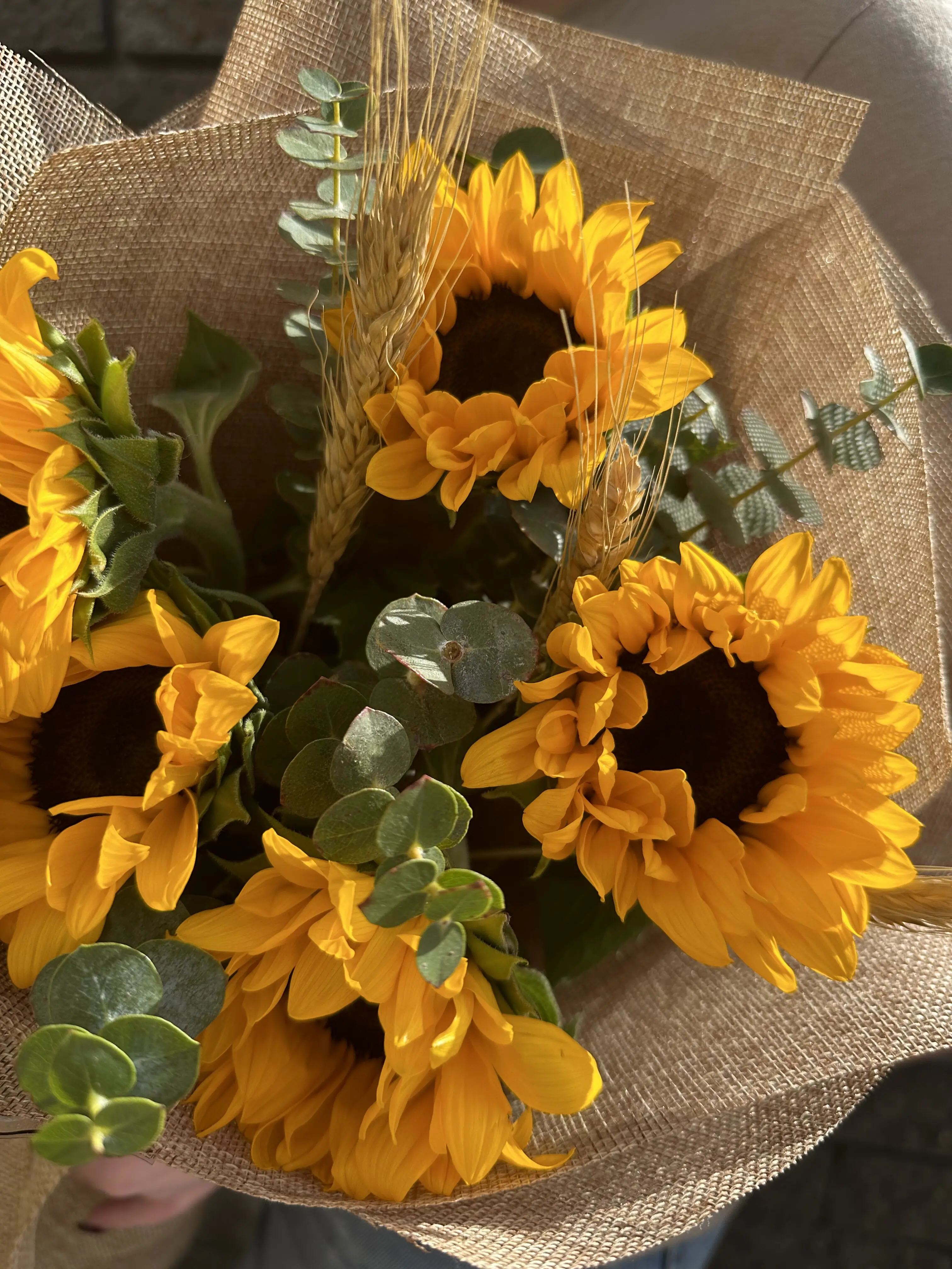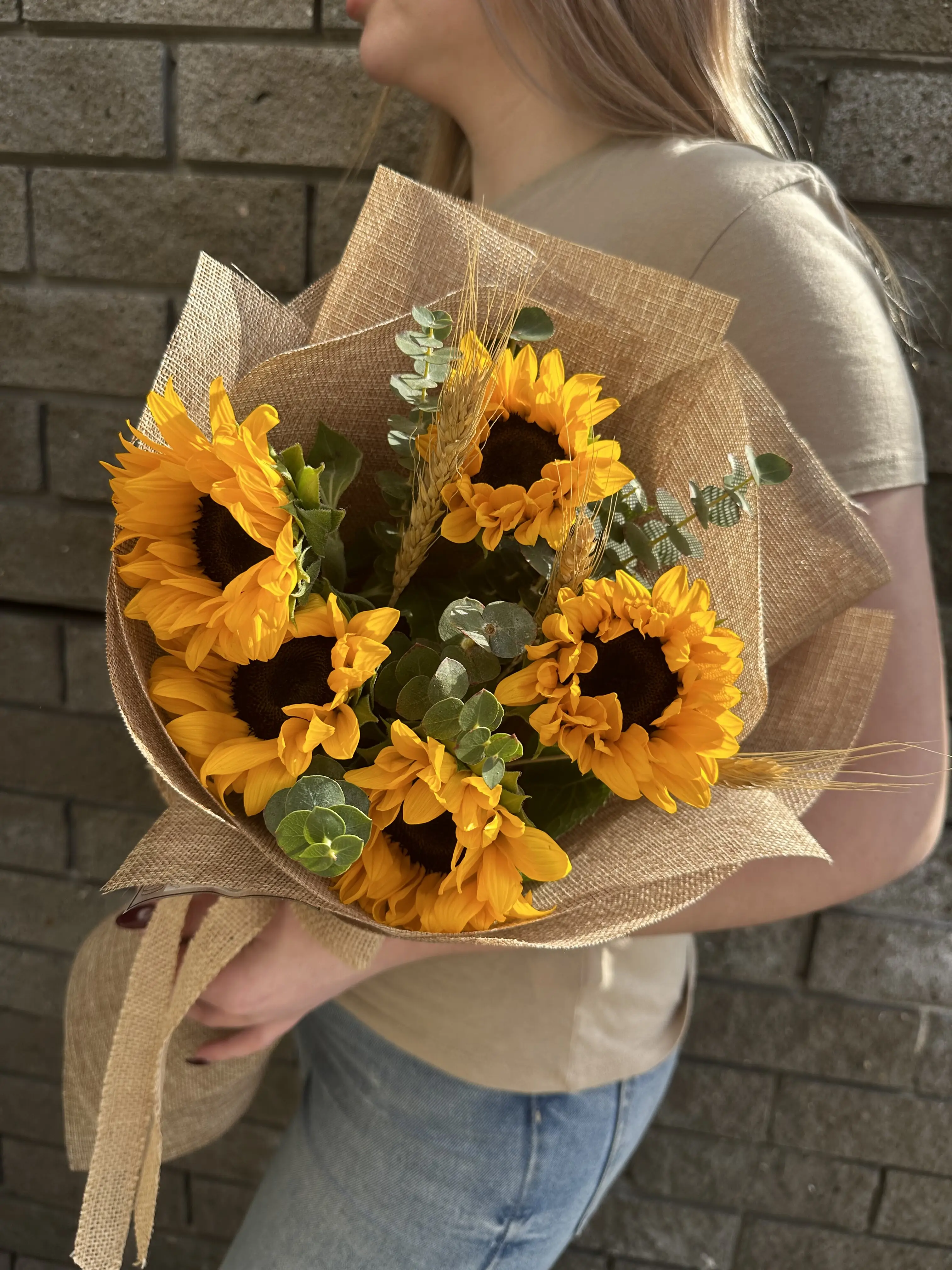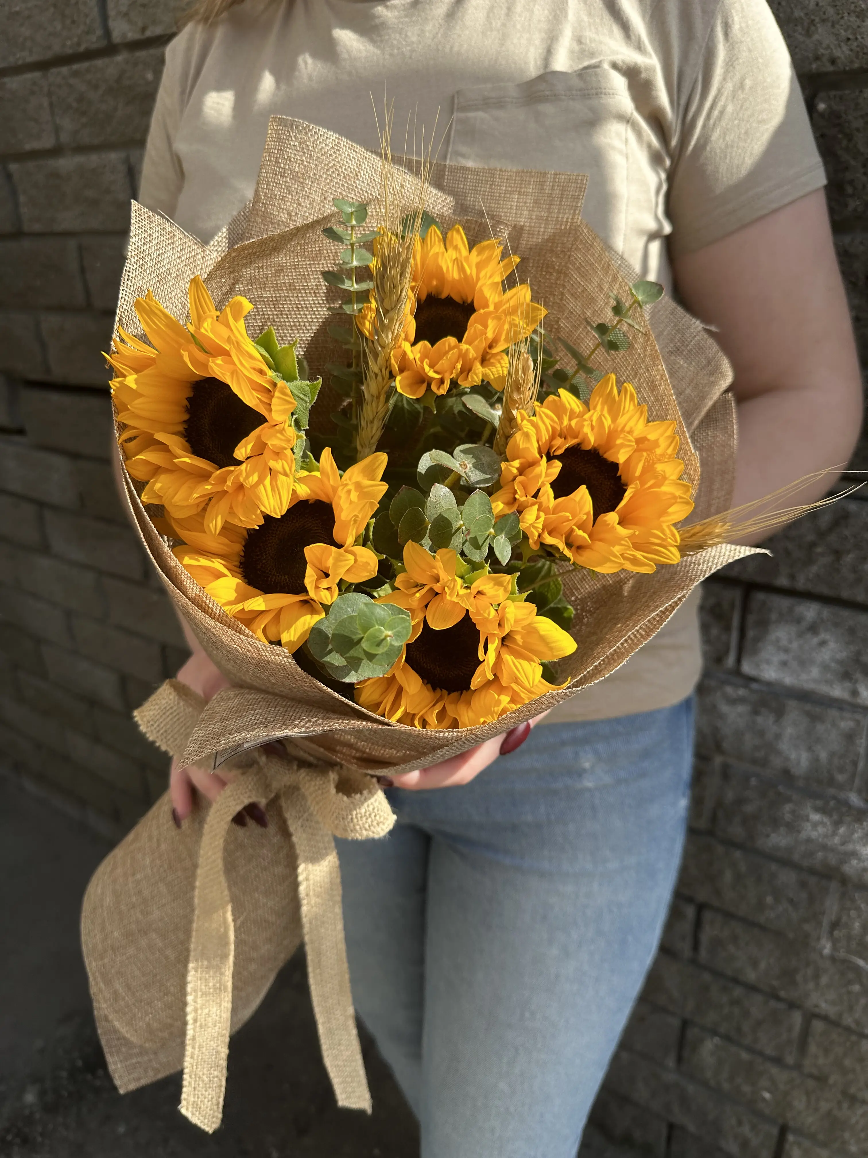 Букет состоит из 5 ярких подсолнухов, которые привнесут в ваш дом солнечное настроение и радость. Пшеница и эвкалипт добавляют композиции свежести и аромата.