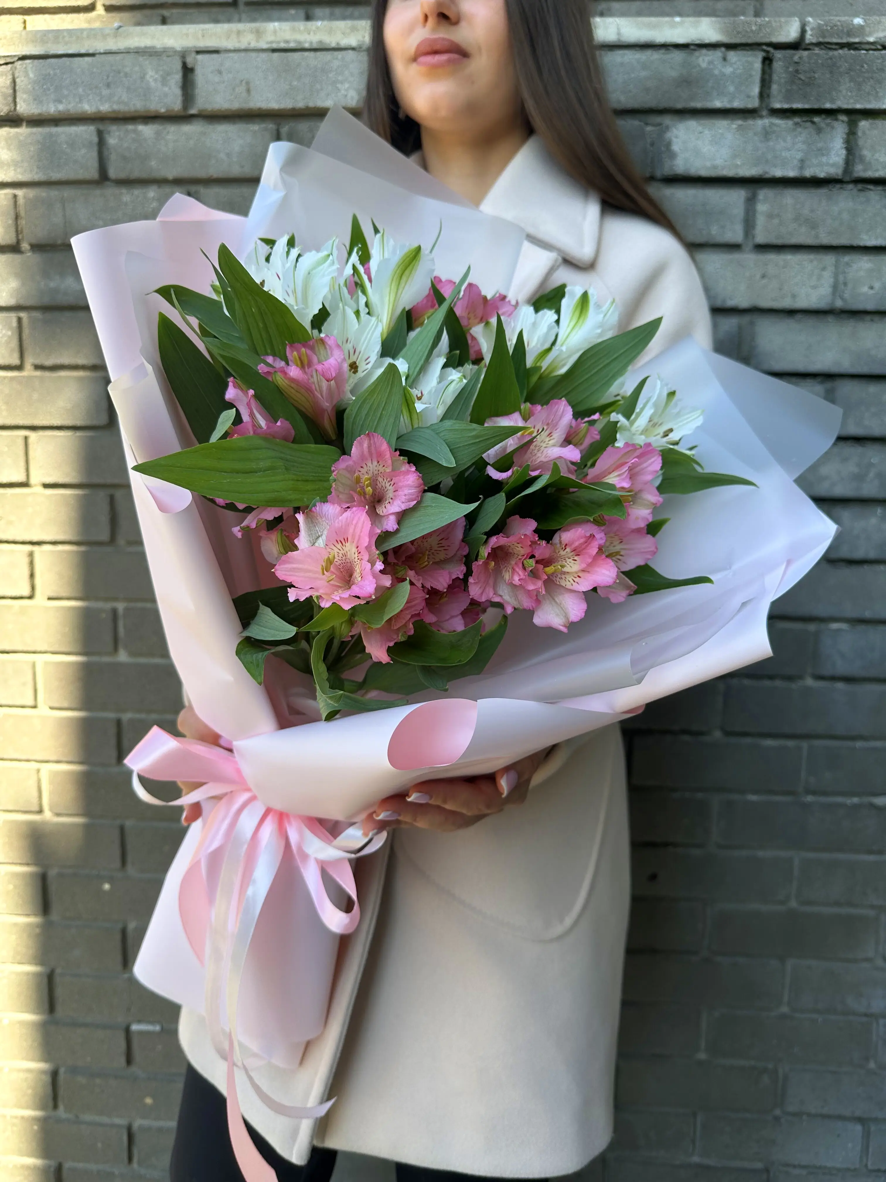 Букет живых цветов из белой и розовой альстромерии в дизайнерской упаковке – это изысканный и стильный подарок, который станет прекрасным дополнением к любому торжеству или событию. Букет состоит из 7 штук белой и розовой альстромерии, которые собраны на стеблях и оформлены в дизайнерскую упаковку. Высота букета составляет 45 см, что делает его заметным и запоминающимся. Альстромерия – это яркий и нежный цветок, который добавит свежести и романтики в любой интерьер. Дизайнерская упаковка придает букету особый шарм и элегантность. Она выполнена в виде пленки и украшена атласной лентой, что делает подарок еще более привлекательным и запоминающимся. Букет требует ежедневного ухода. Прежде всего, необходимо подрезать стебли острым ножом или секатором, чтобы они не засыхали. Также важно размещать букет вдали от прямых солнечных лучей и отопительных приборов, а воду в букете менять ежедневно. Такой подарок будет уместен на любом празднике или торжестве, будь то День святого Валентина, День учителя, День знаний, выпускной, 8 Марта, день свадьбы, День матери, день рождения, День Победы, юбилей или День семьи. Букет живых цветов из белой и розовой альстромерии в дизайнерской упаковке – это не просто подарок, это символ любви, заботы и внимания, который будет радовать и напоминать о вас каждый день.