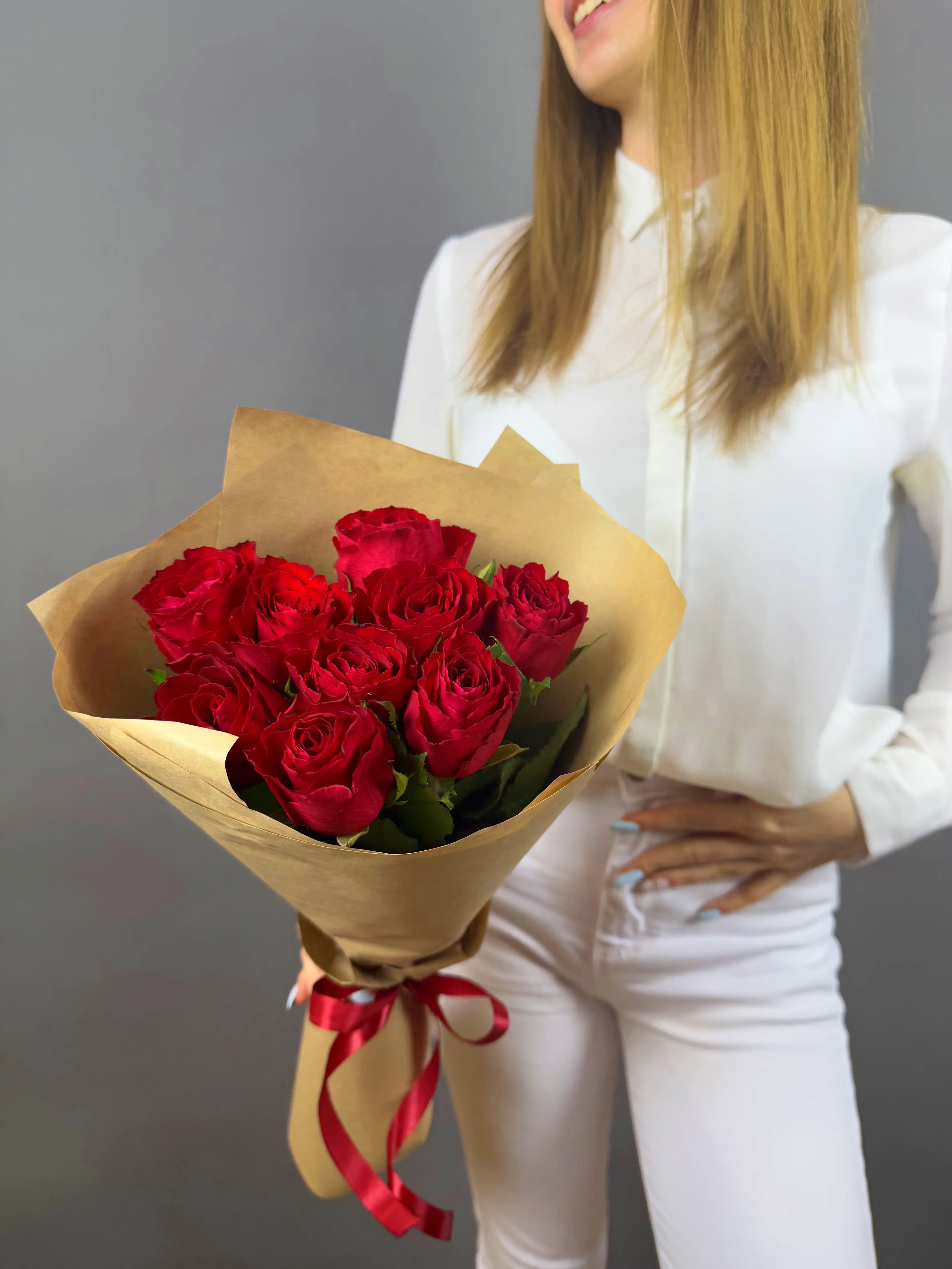 Букет состоит из 9 красных роз премиум качества, что гарантирует свежесть и красоту цветов.