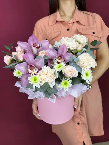 Букет живых цветов с орхидеями и нежными розами в шляпной коробке - это изысканный и стильный подарок, который станет незабываемым сюрпризом для любого случая.