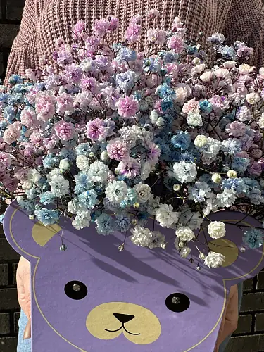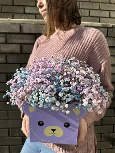 Букет состоит из трех видов радужной гипсофилы, что придает ему неповторимый и яркий вид. Гипсофила – это цветок, который отличается своей стойкостью и продолжительным сроком жизни.