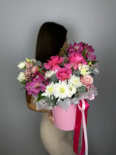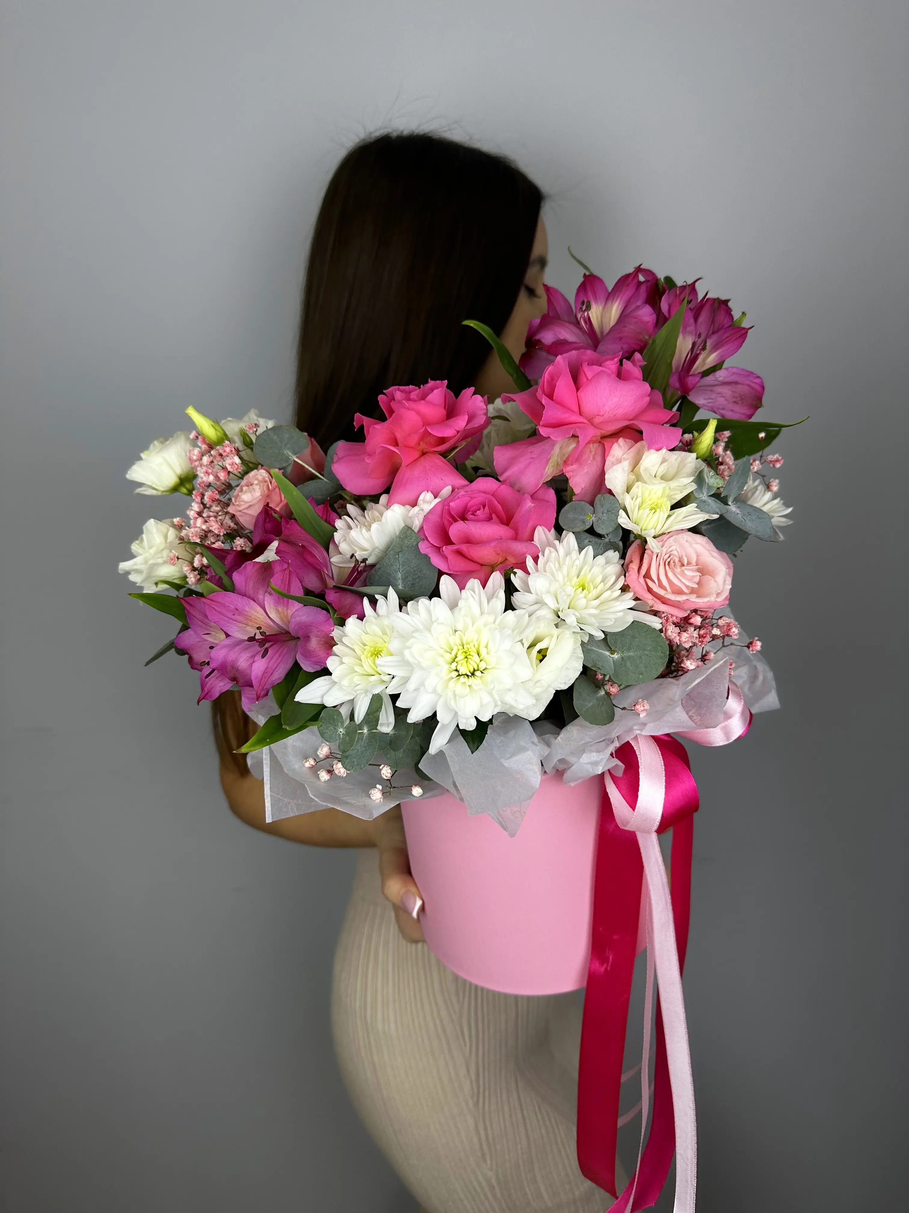 Букет живых цветов с розами и альстромерией в нежной шляпной коробке – это прекрасный выбор для тех, кто хочет подарить радость и теплоту своих чувств.