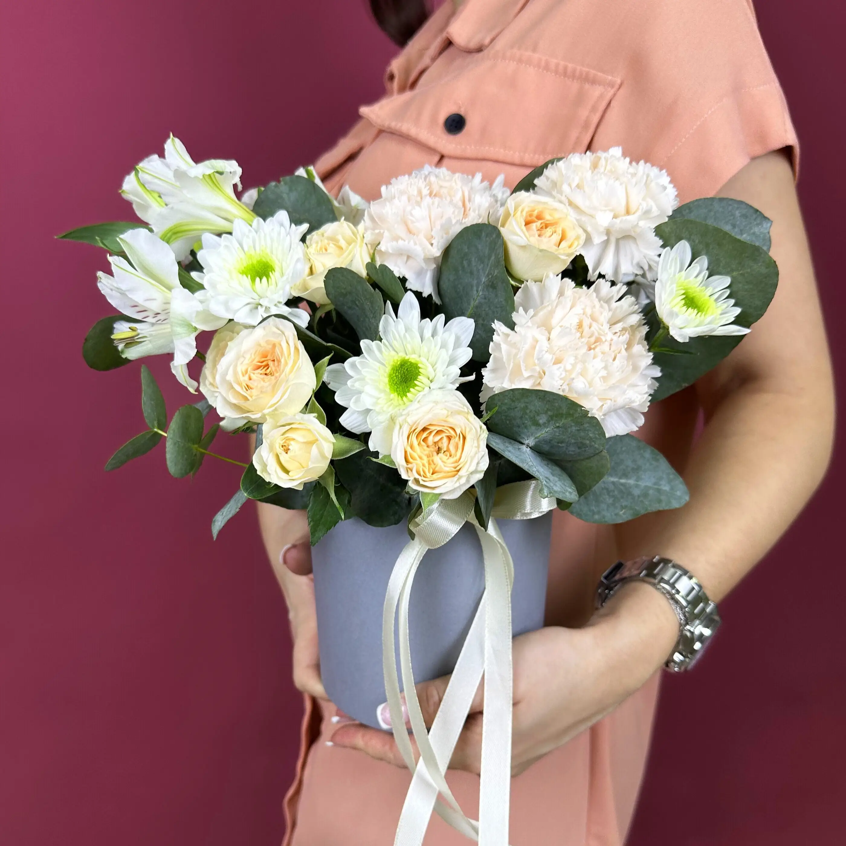 Букет состоит из диантусов (3 шт.), кустовых роз (2 шт.), альстромерий (1 шт.), кустовых хризантем (1 шт.), эвкалипта (4 шт.), коробки и флористической губки.