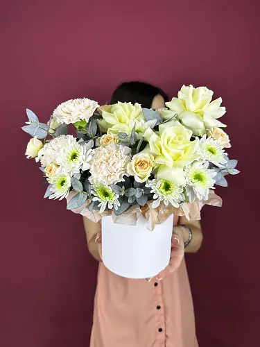 Букет живых цветов с нежными розами и хризантемой в красивой шляпной коробке от Salon Buket – это сочетание изысканности и элегантности, которое станет прекрасным подарком для любого случая.