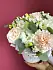 Букет состоит из 7 диантусов, 2 эустом, 1 статицы, 2 эвкалипта и 1 шляпной коробки.