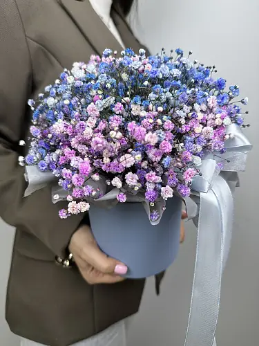 Выбирая букет живых цветов с радужной гипсофилой в нежной шляпной коробке, вы делаете прекрасный и продуманный выбор, который обязательно порадует и удивит получателя.