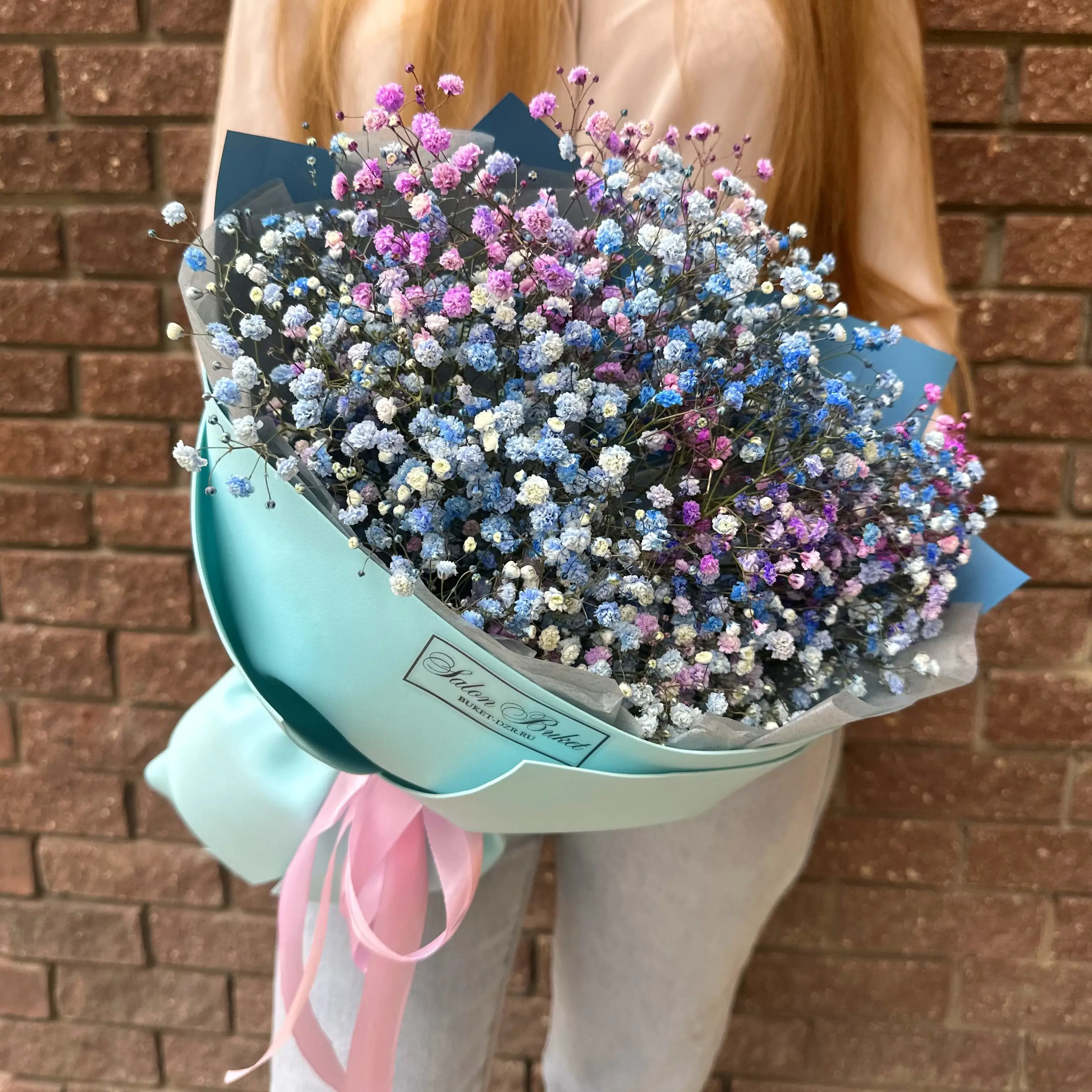 Букет живых цветов из радужной гипсофилы в дизайнерской голубой упаковке