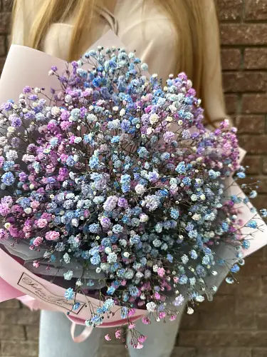 Букет живых цветов из радужной гипсофилы в дизайнерской упаковке