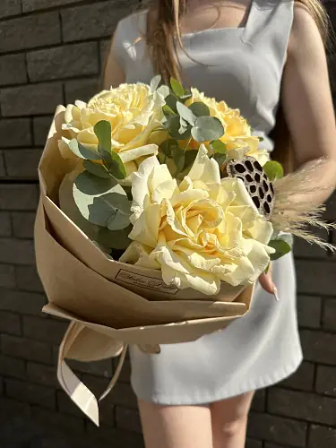 Букет живых цветов из белых роз и эвкалипта в дизайнерской упаковки