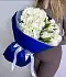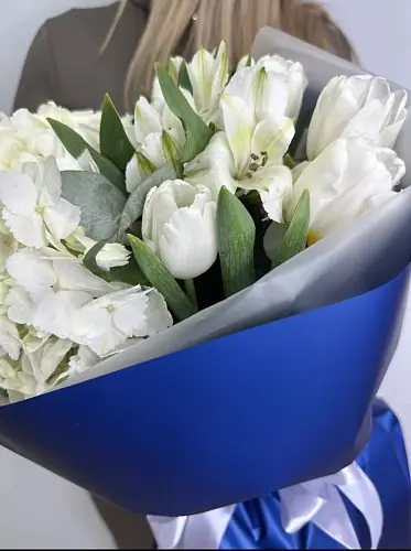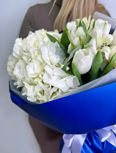 Букет живых цветов с белыми тюльпанами и гортензией в дизайнерской упаковке