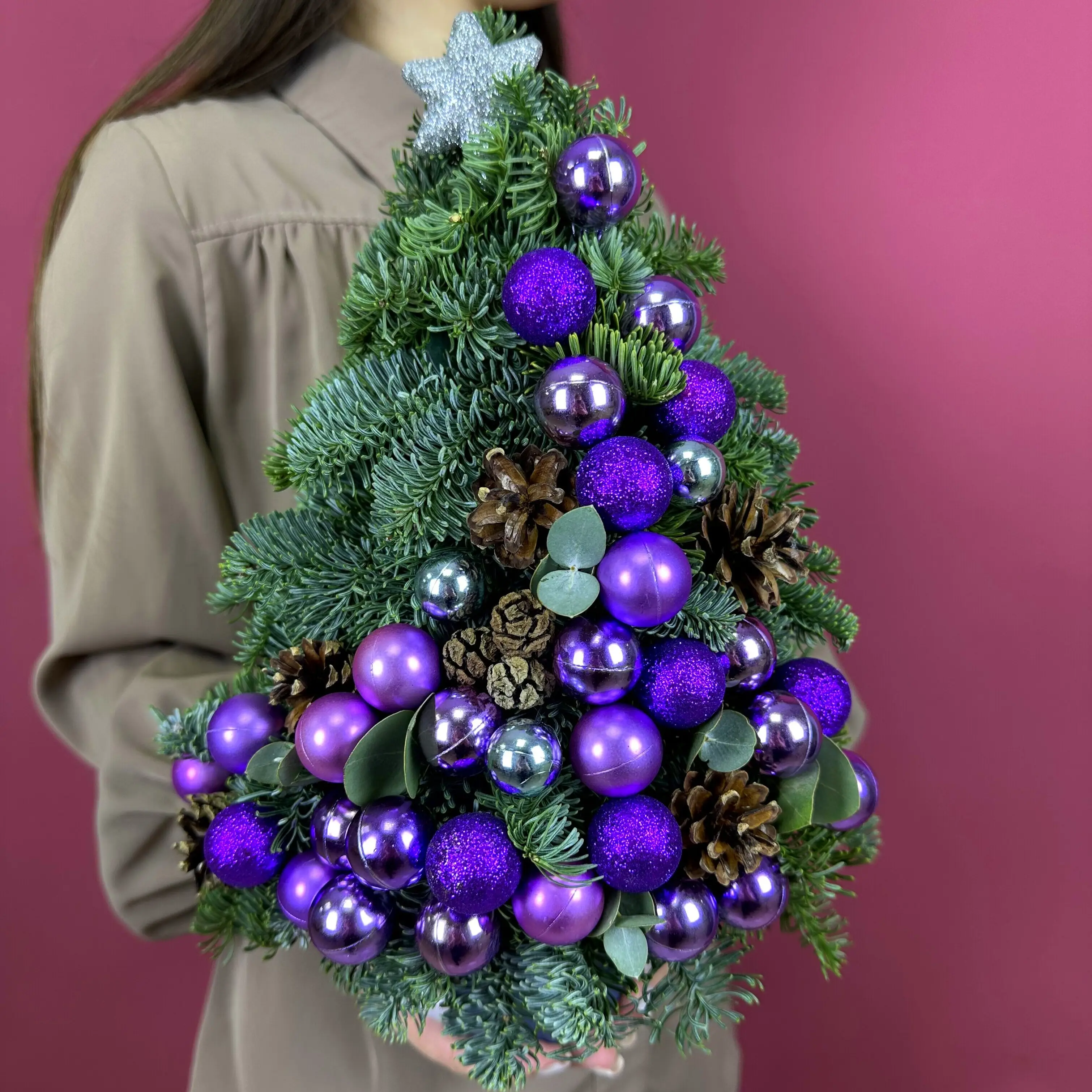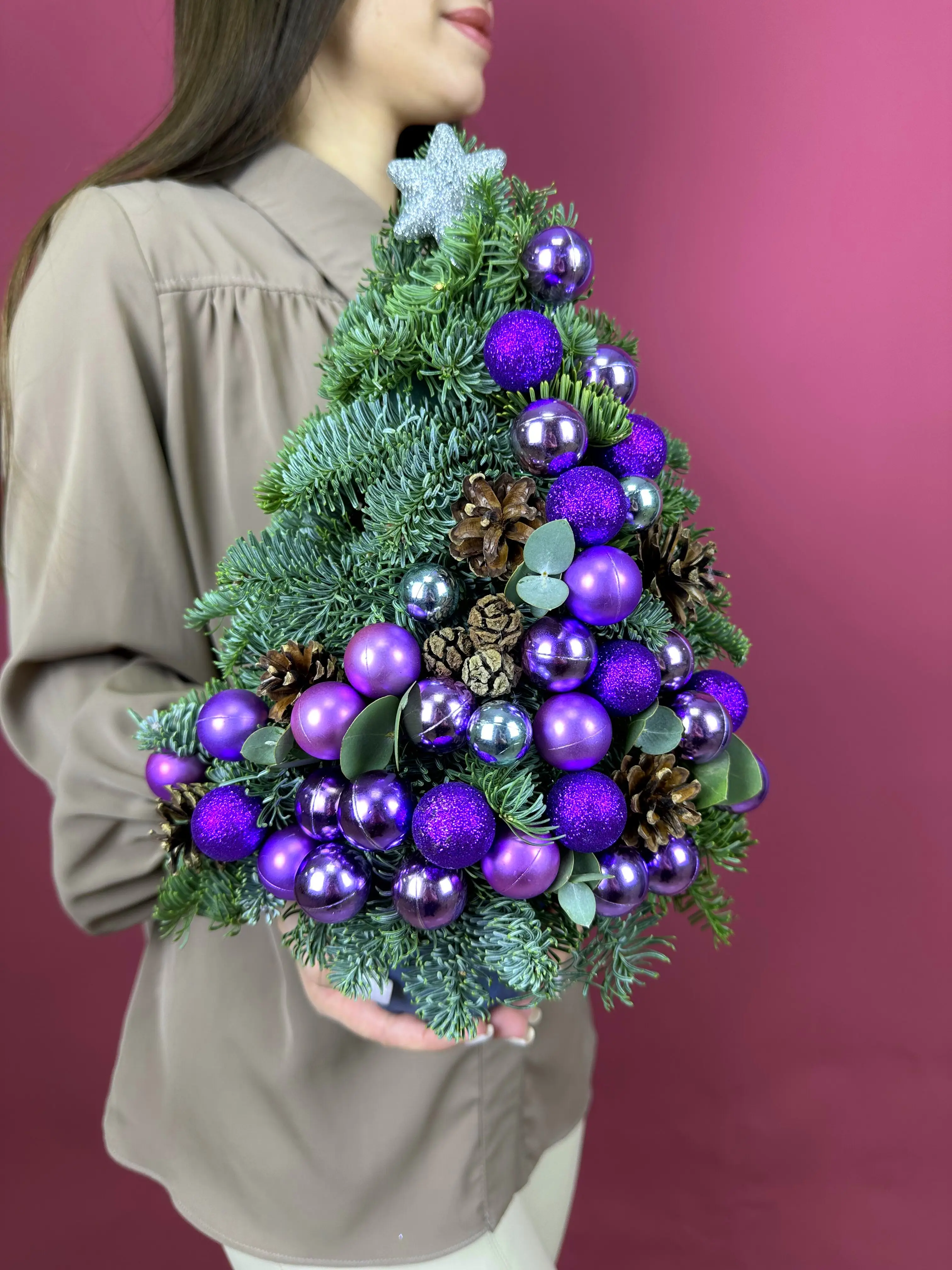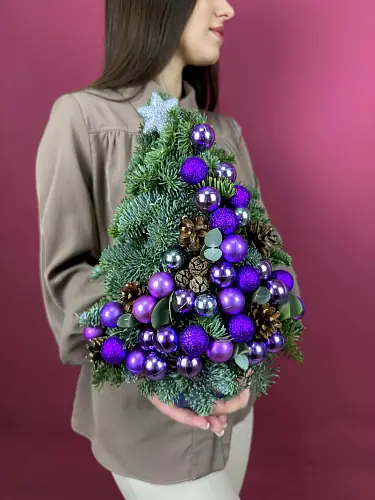 Цветы живые, Новогодняя композиция из с нобилисом "Елка с фиолетовыми шарами"
