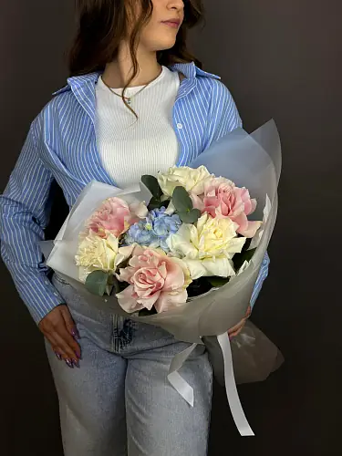 Нежный букет Живых цветов с розами и гортензией в дизайнерской упаковке
