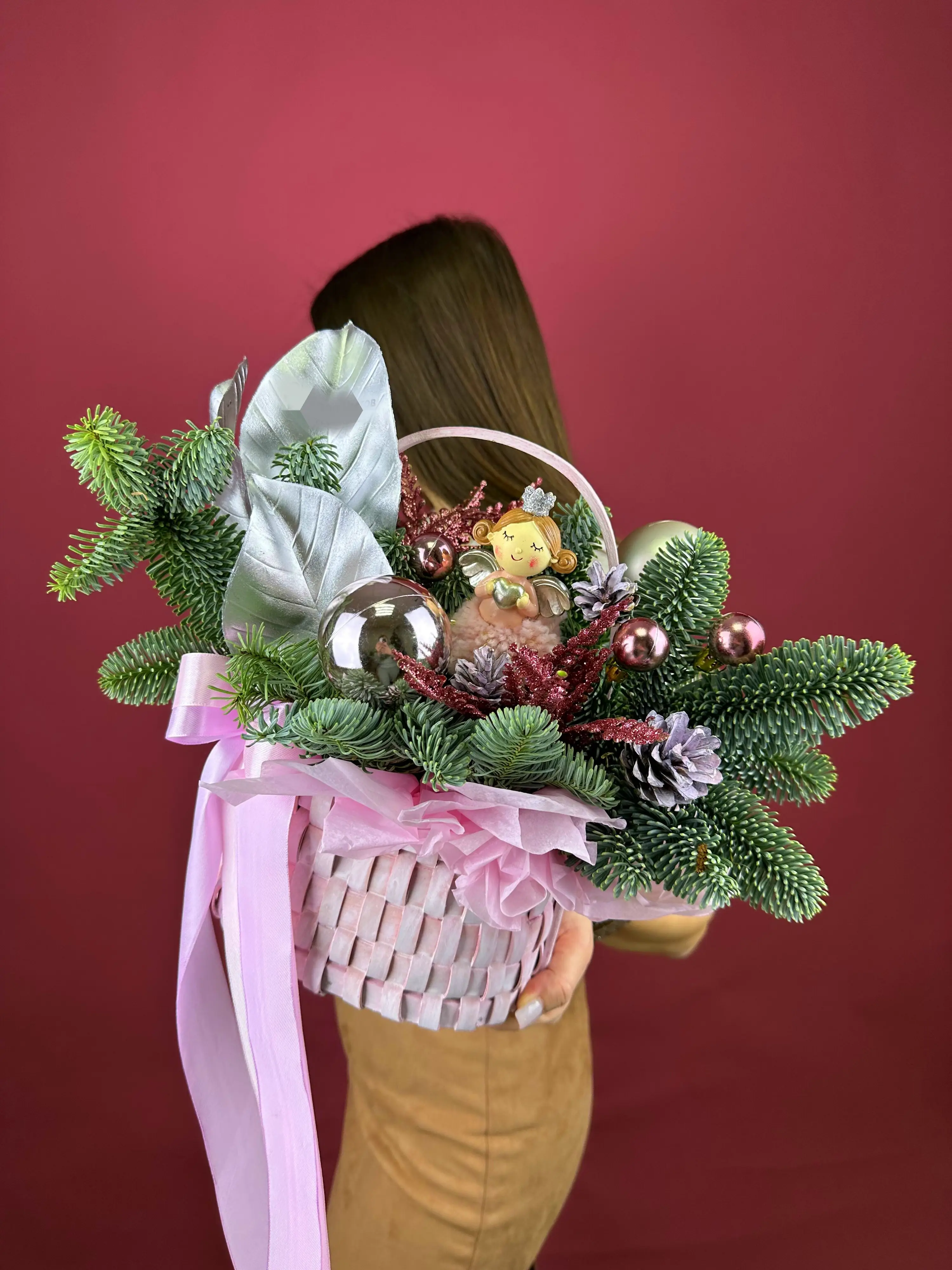 Цветы живые, Новогодняя композиция с нобилисом и феей в розовой корзине