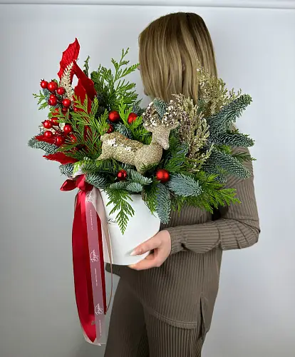 Цветы живые, Новогодняя композиция с нобилисом и туей в шляпной коробке