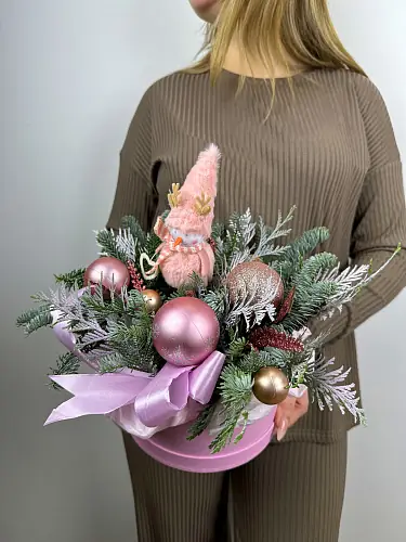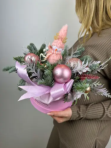 Цветы живые, Новогодняя композиция с нобилисом и снеговиком в шляпной коробке
