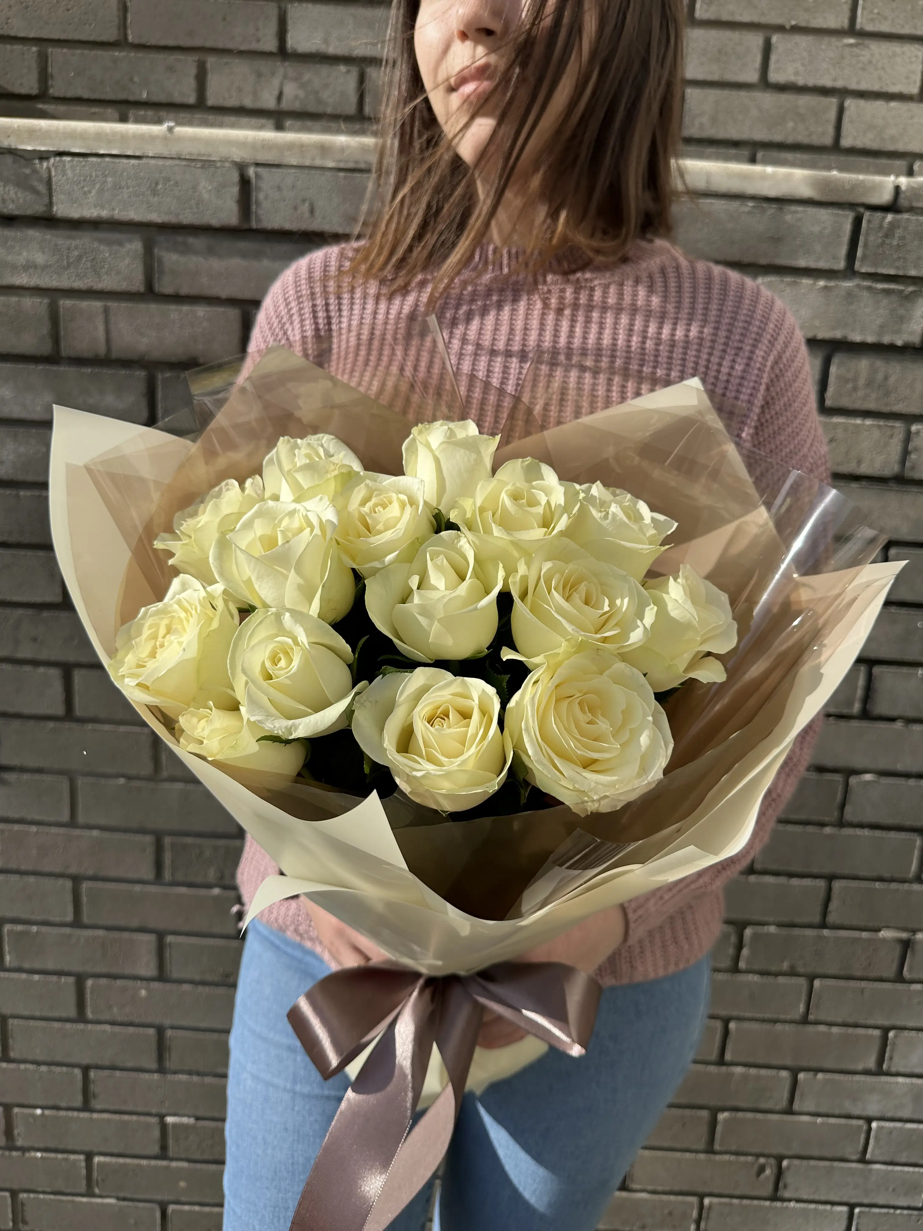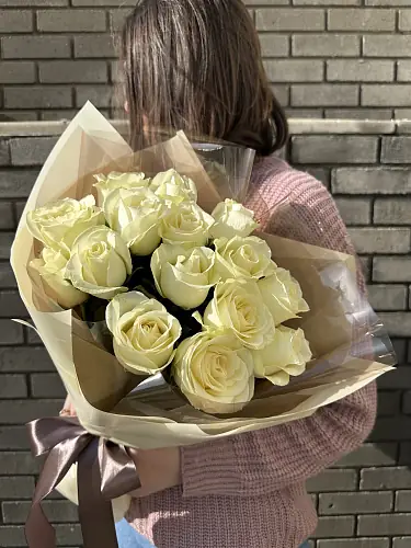 Букет живых цветов из 15 Белоснежных роз оформленный в дизайнерскую упаковку