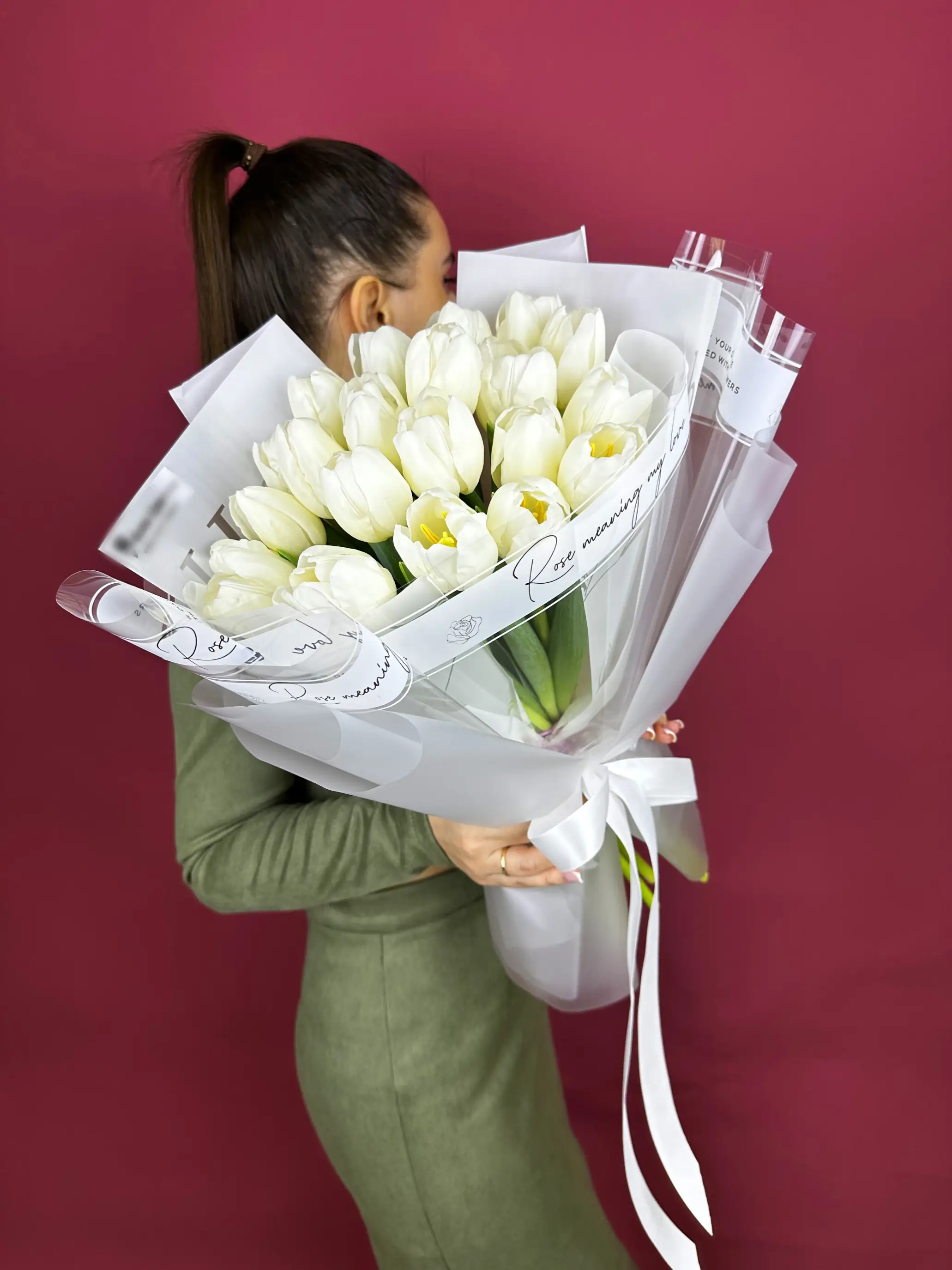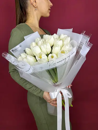 Букет живых цветов из 21 белого тюльпана в дизайнерской упаковке