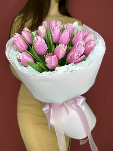 Букет живых цветов из 21 Розового тюльпана в дизайнерской упаковке