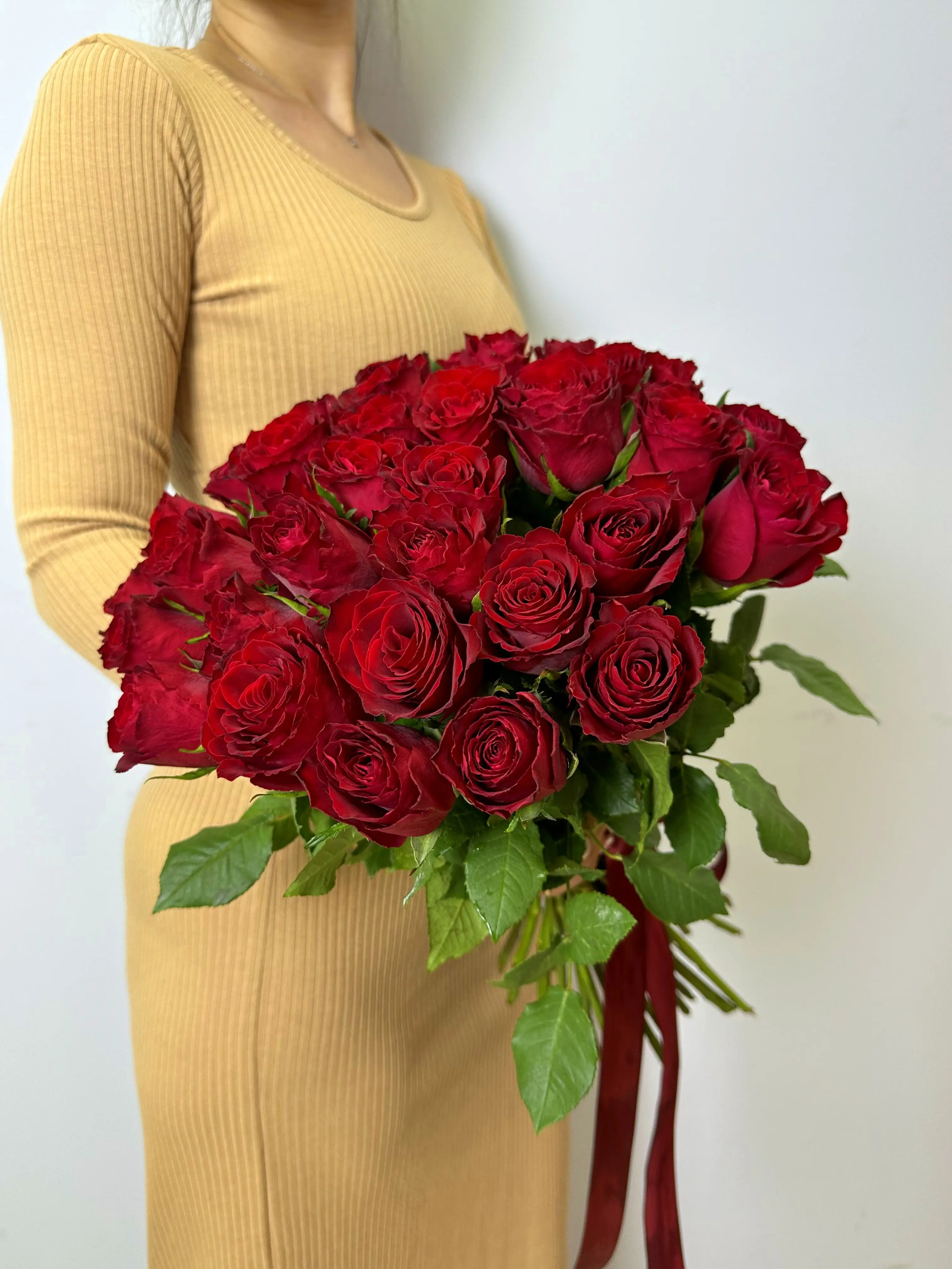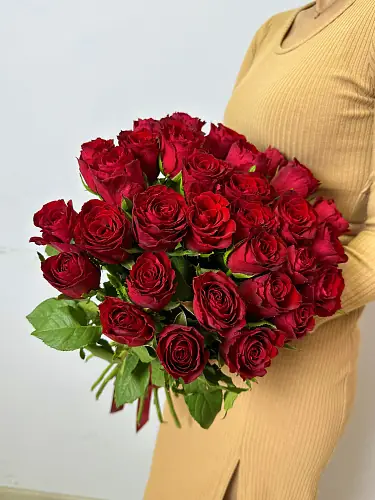Букет живых цветов из 35 Красных роз оформленный в дизайнерскую упаковку