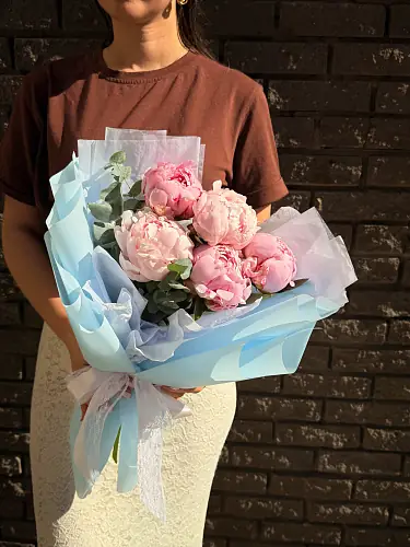 Букет живых цветов из 5 Пионов оформленный в крафтовую бумагу