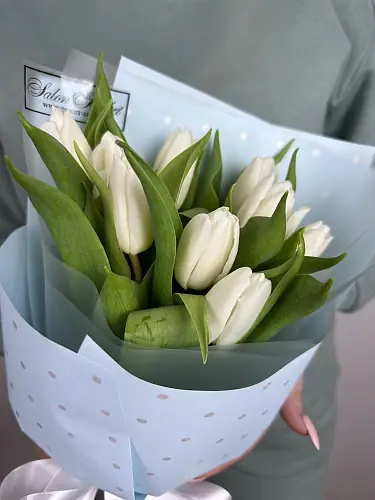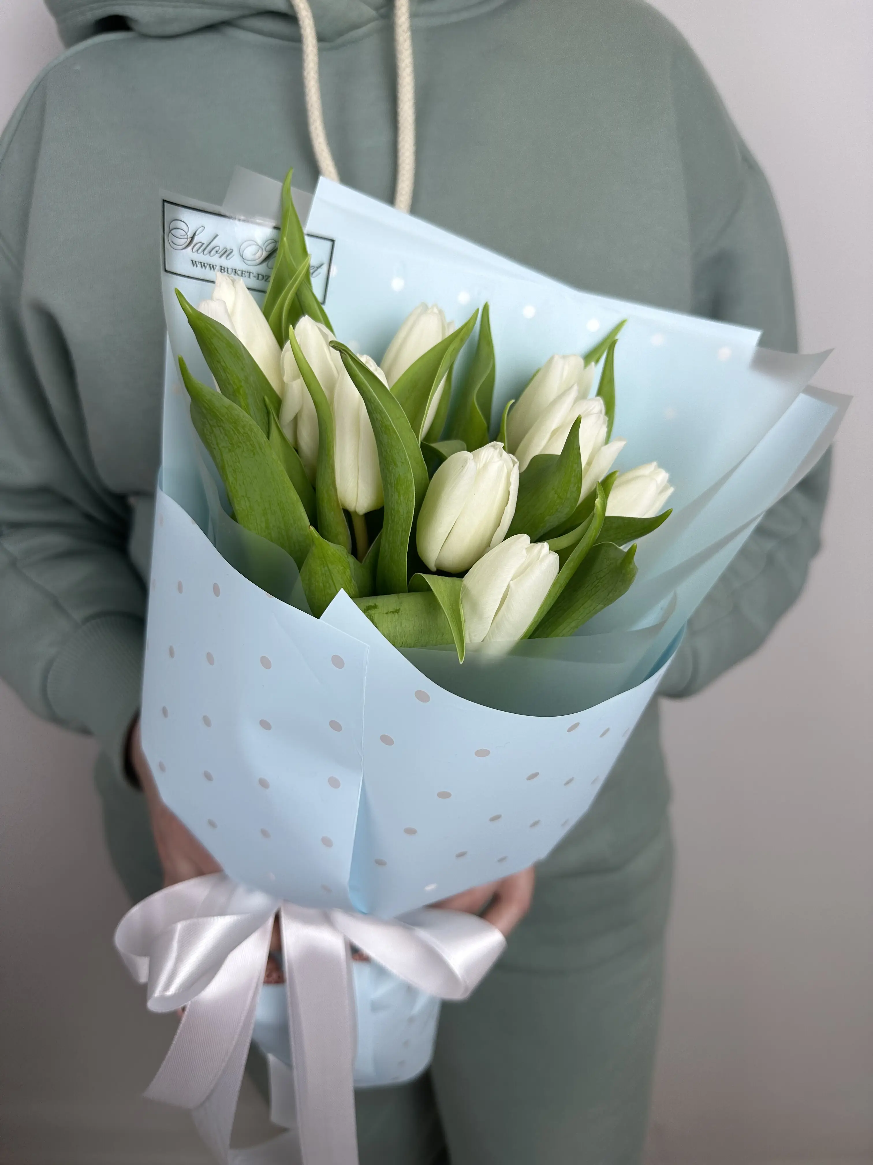 Букет живых цветов из 9 белых тюльпанов в дизайнерской упаковке