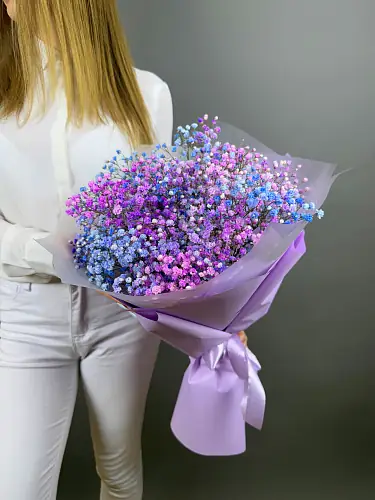 Букет живых цветов из радужной гипсофилы микс в дизайнерской упаковке
