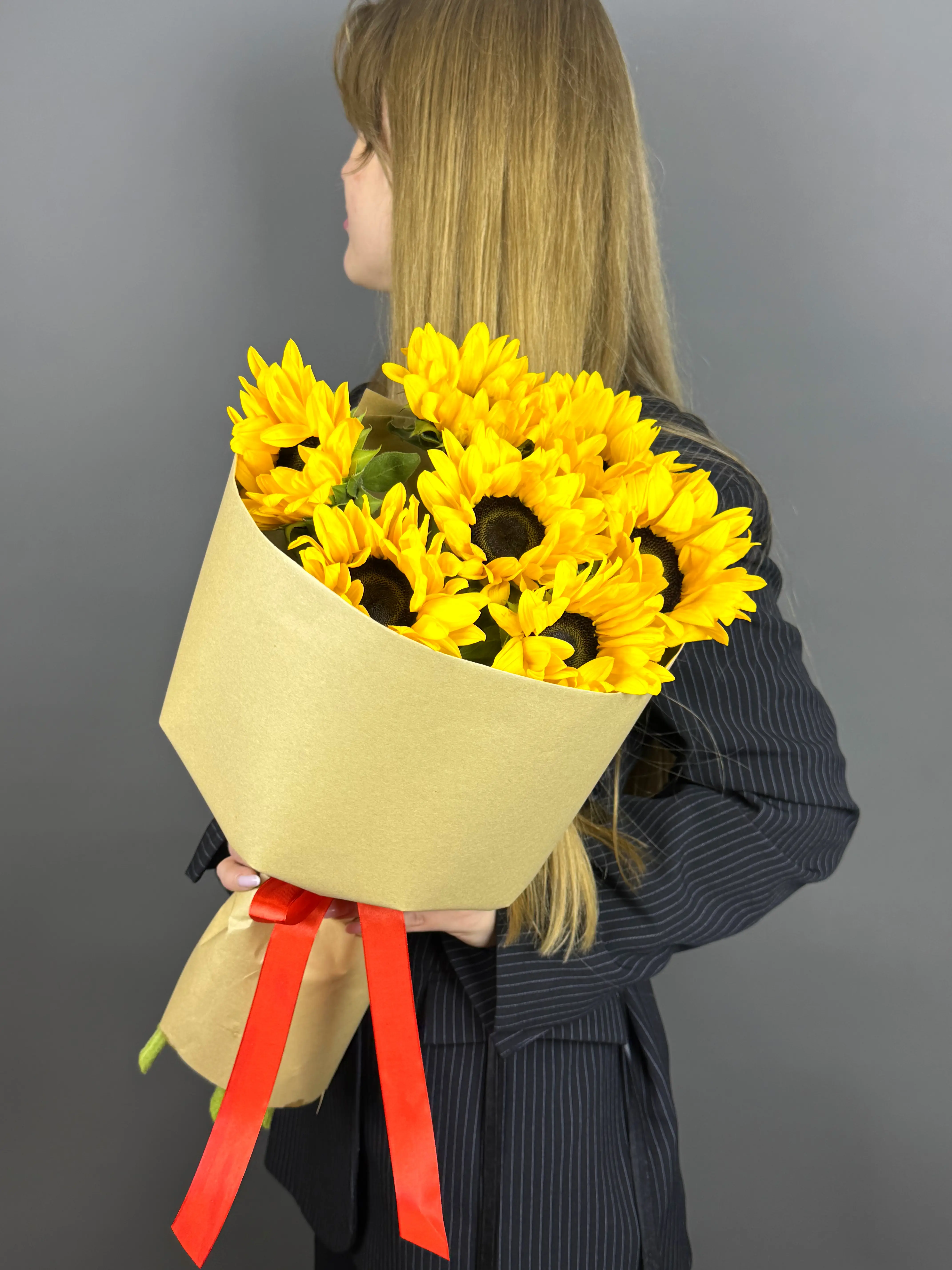 Букеты живых цветов "Солнечный" из подсолнухов в дизайнерской упаковке