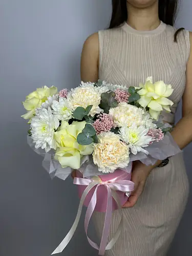 Букет живых цветов с хризантемой и белой французской розой в шляпной коробке