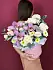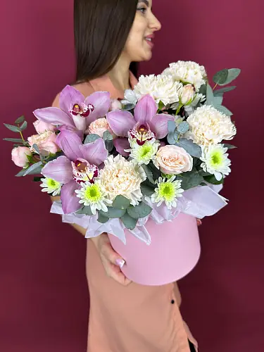 Букет живых цветов с орхидеями и нежными розами в шляпной коробке