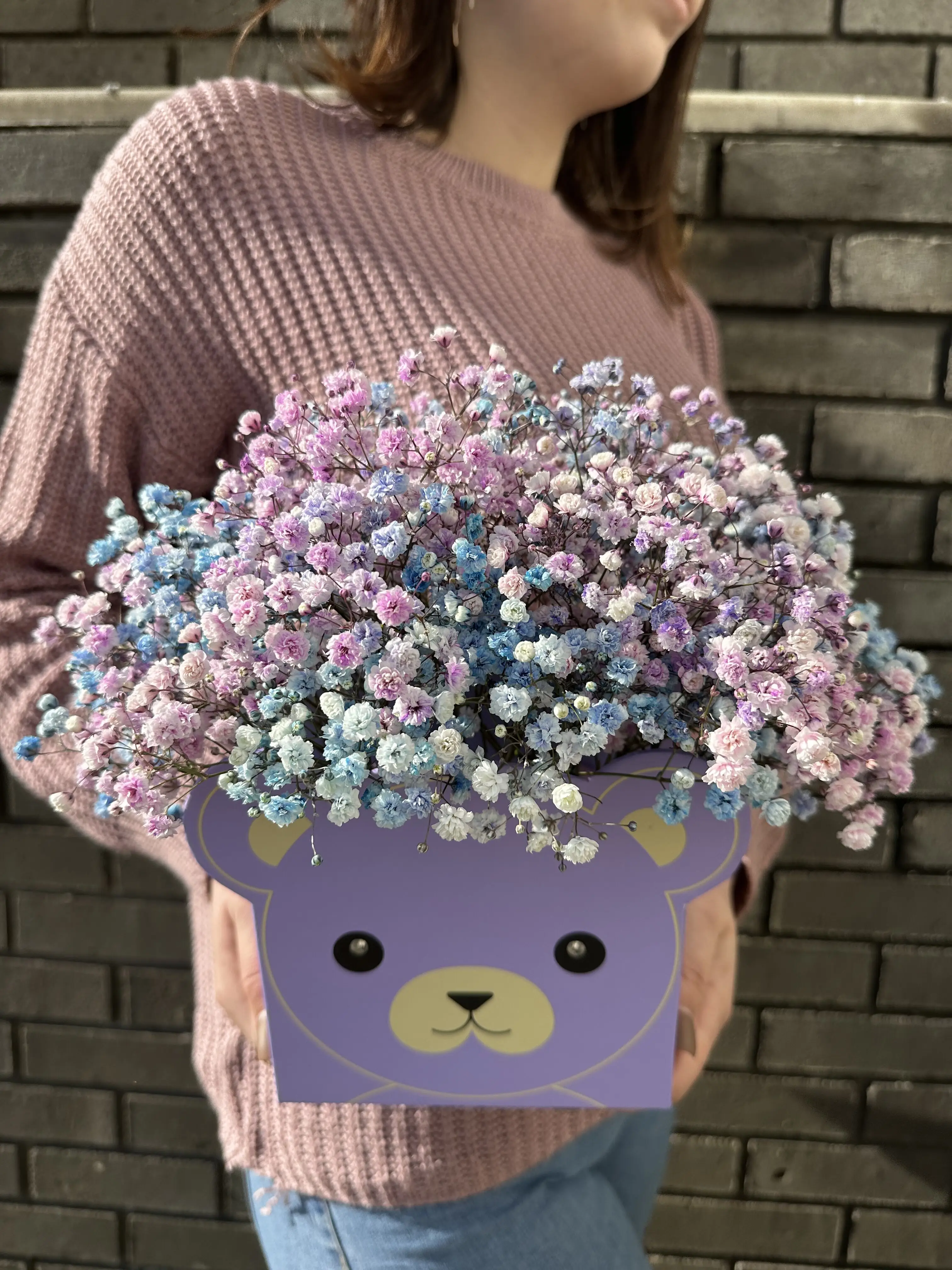 Букет живых цветов с радужной гипсофилой микс в сумочке нежного цвета
