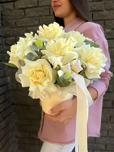 Букет живых цветов с французскими белыми розами и статицей в шляпной коробке