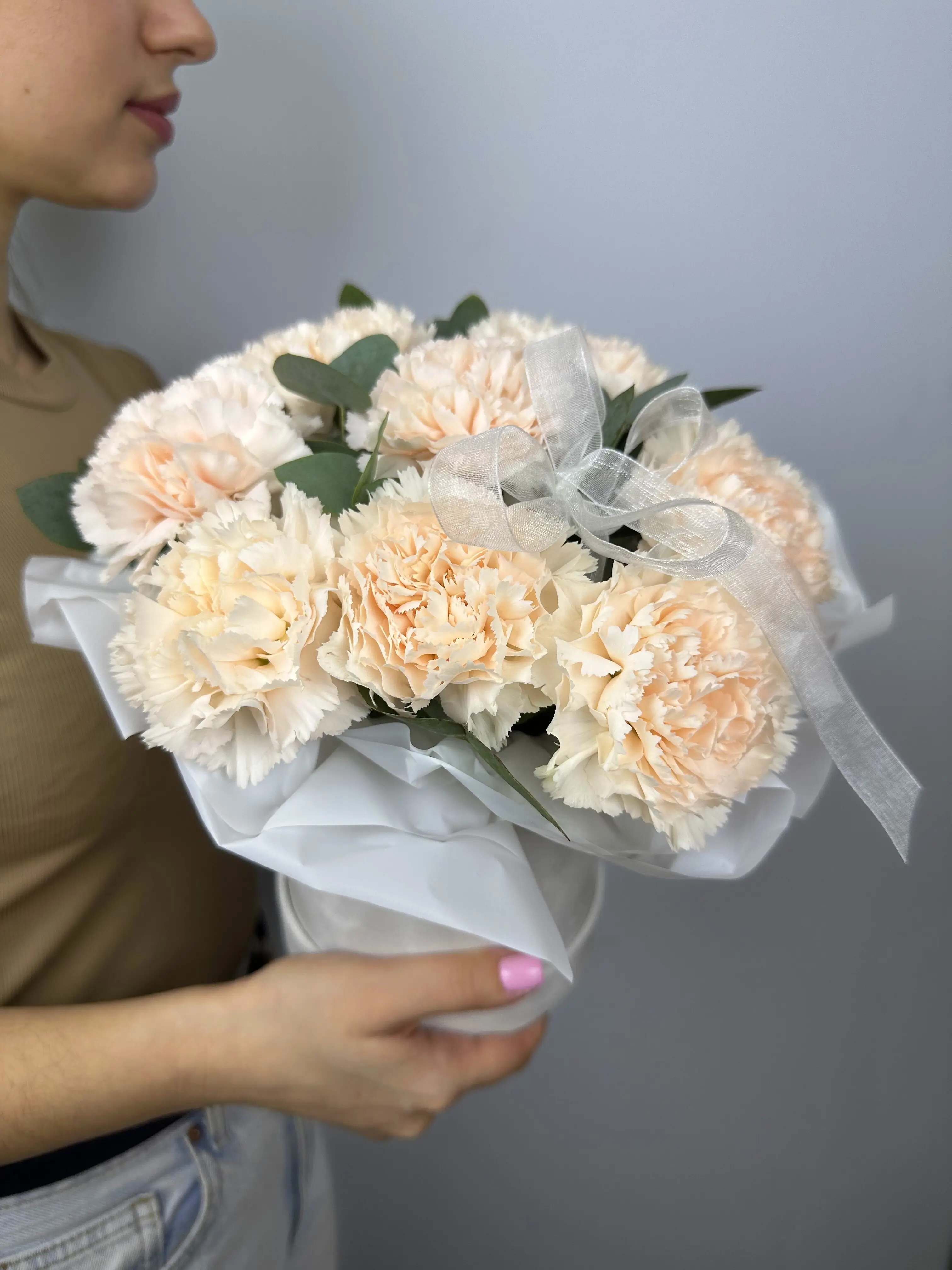 Букет живых цветов из нежных диантусов в белоснежной шляпной коробке