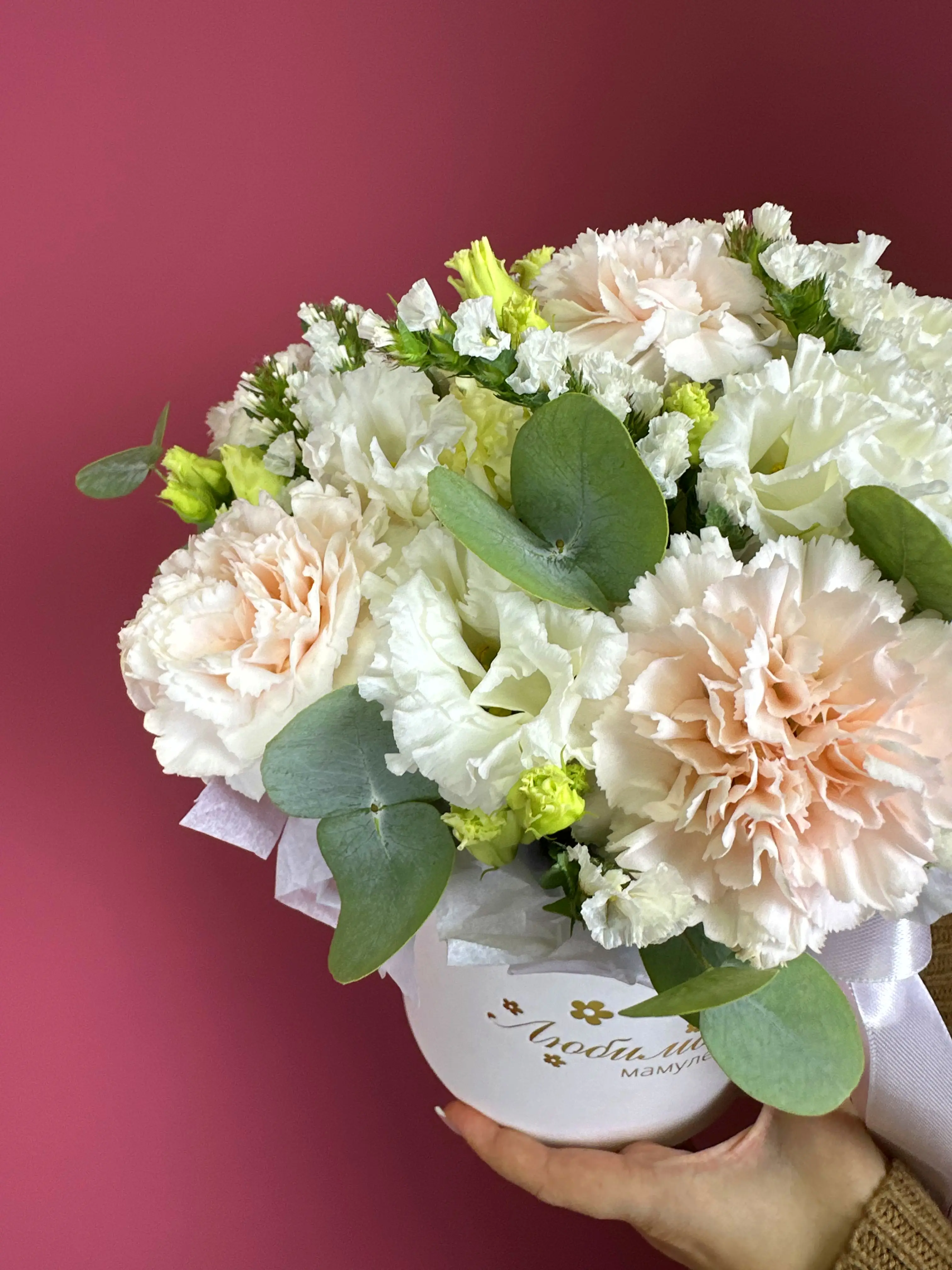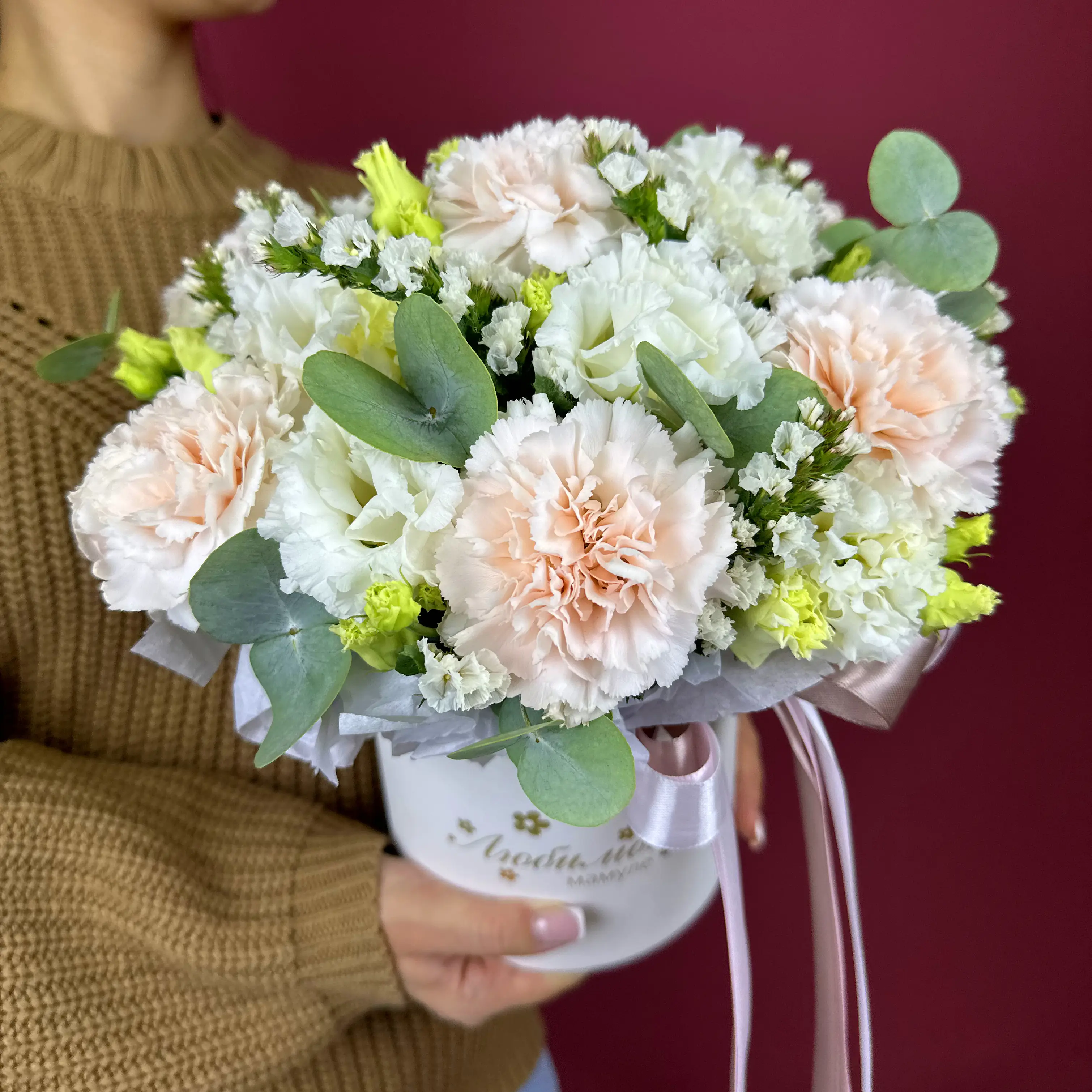 Букет живых цветов с диантусом (гвоздикой) и эустомой в шляпной коробке