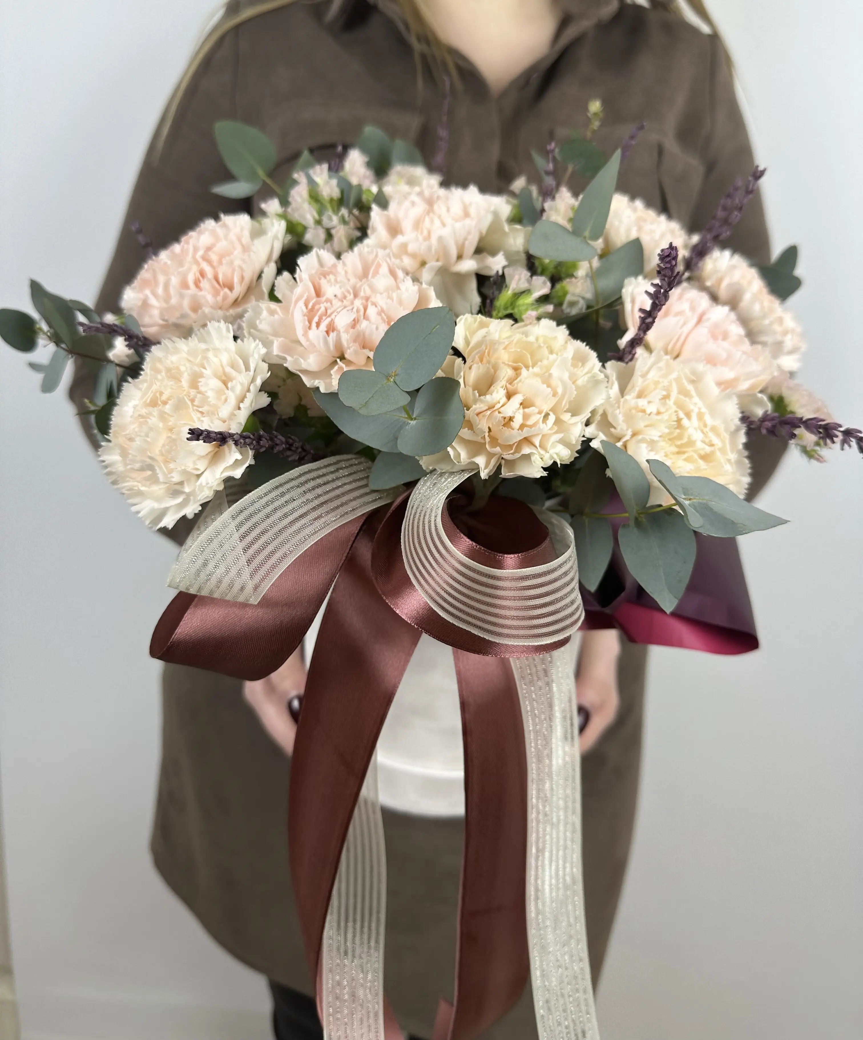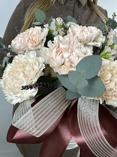 Букет живых цветов с кружевными диантусами в шляпной коробке